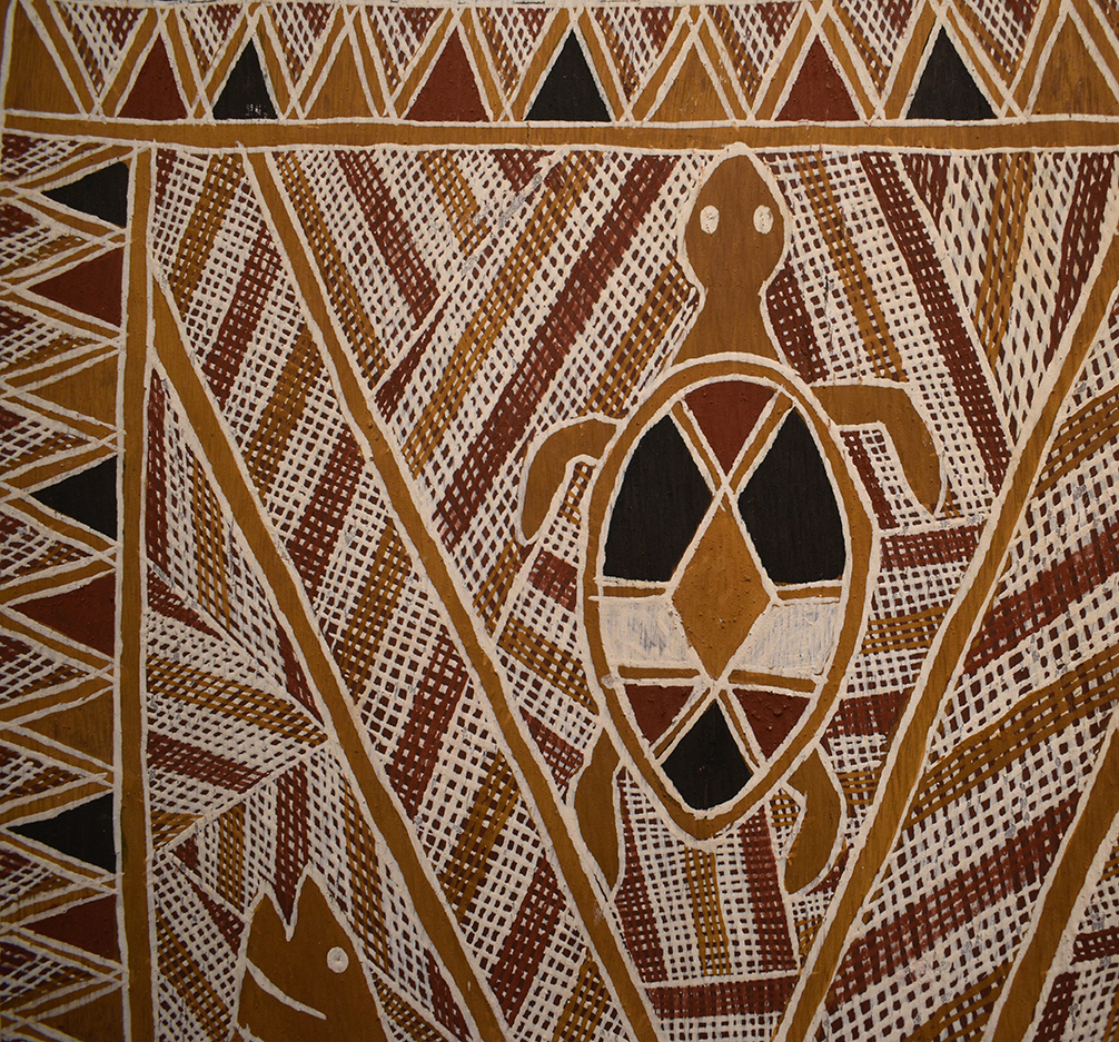 His work is rooted in the continuity of knowledge passed down within his community. John Baya creates bark paintings as well as carved wooden sculptures, which he adorns with clan motifs rendered in natural pigments. These designs, composed according to precise cultural codes, refer to Dreamtime stories, ancestral beings, and the sacred connections linking people to the land and waters of Arnhem Land.