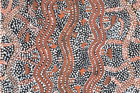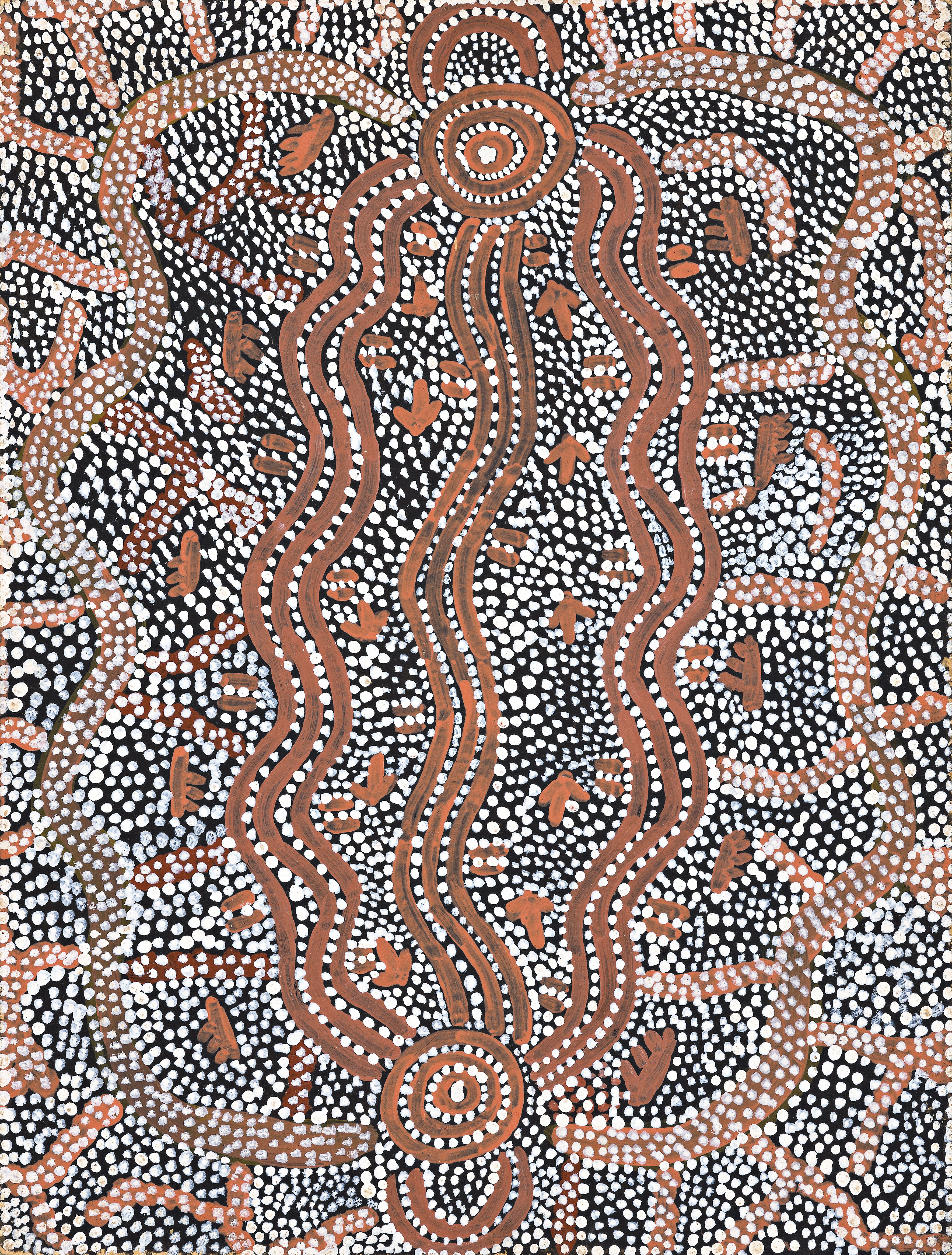 Old Walter Tjampitjimpa est un artiste aborigène de la communauté de Papunya, au coeur du désert Australien. Ce sont des hommes comme Old Walter Tjampitjinpa qui, par leur travail, ont rendu célèbres les codes graphiques minimalistes immédiatement reconnaissables des peuples aborigènes du désert. En effet, en 1971, un nouvel instituteur nommé Geoffrey Bardon fut envoyé à Papunya. Ayant remarqué que les Aborigènes dessinaient des motifs sur le sable, il apprit des anciens que ces symboles étaient liés à des légendes et récits pluri-millénaires. Intrigué, il encouragea alors les aînés à transposer leurs légendes sur des supports pérennes. Après de longs pourparlers, ceux-ci acceptèrent de le faire, d’abord sur le mur de l’école de Papunya, puis peu à peu sur d’autres supports comme des planches de contre-plaqué, des panneaux de métal, des carreaux de céramique récupérés sur les chantiers de construction et enfin de la toile. Plus que de l’art, il s’agit d’un véritable manifeste politique de la part d’hommes dont la culture avait été jusque là dénigrée. Leur style unique allié à un vocabulaire graphique jusqu’alors inconnu du grand public a donné naissance à une véritable révolution artistique qui a ouvert la voie à une reconnaissance de la culture et du peuple aborigène australien.