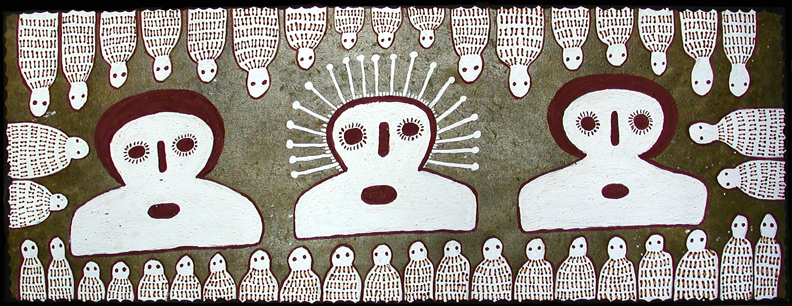 Yvonne was given the right by her mother to represent these motifs inspired by paintings found on the walls of a cave near Ngallagunda (literally "snake head"). Two painted snakes can be seen in this cave, but also the three Wanjinas, represented here, the middle one being the king of the Wanjinas, magnified by his crown. The artist's use of natural pigments - materials of the origins - (kaolin, ochres, charcoal) symbolises his unbreakable links with his past.