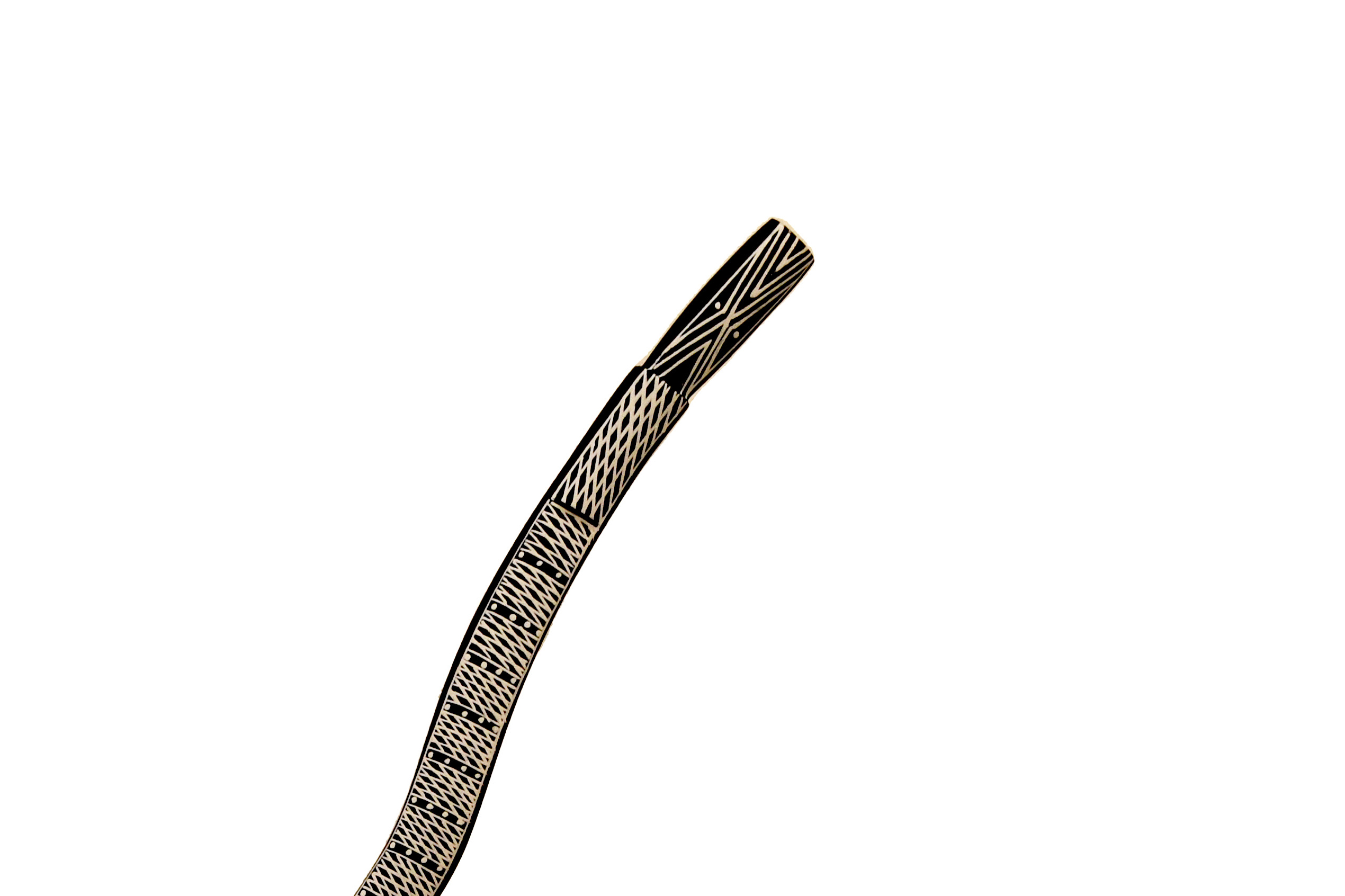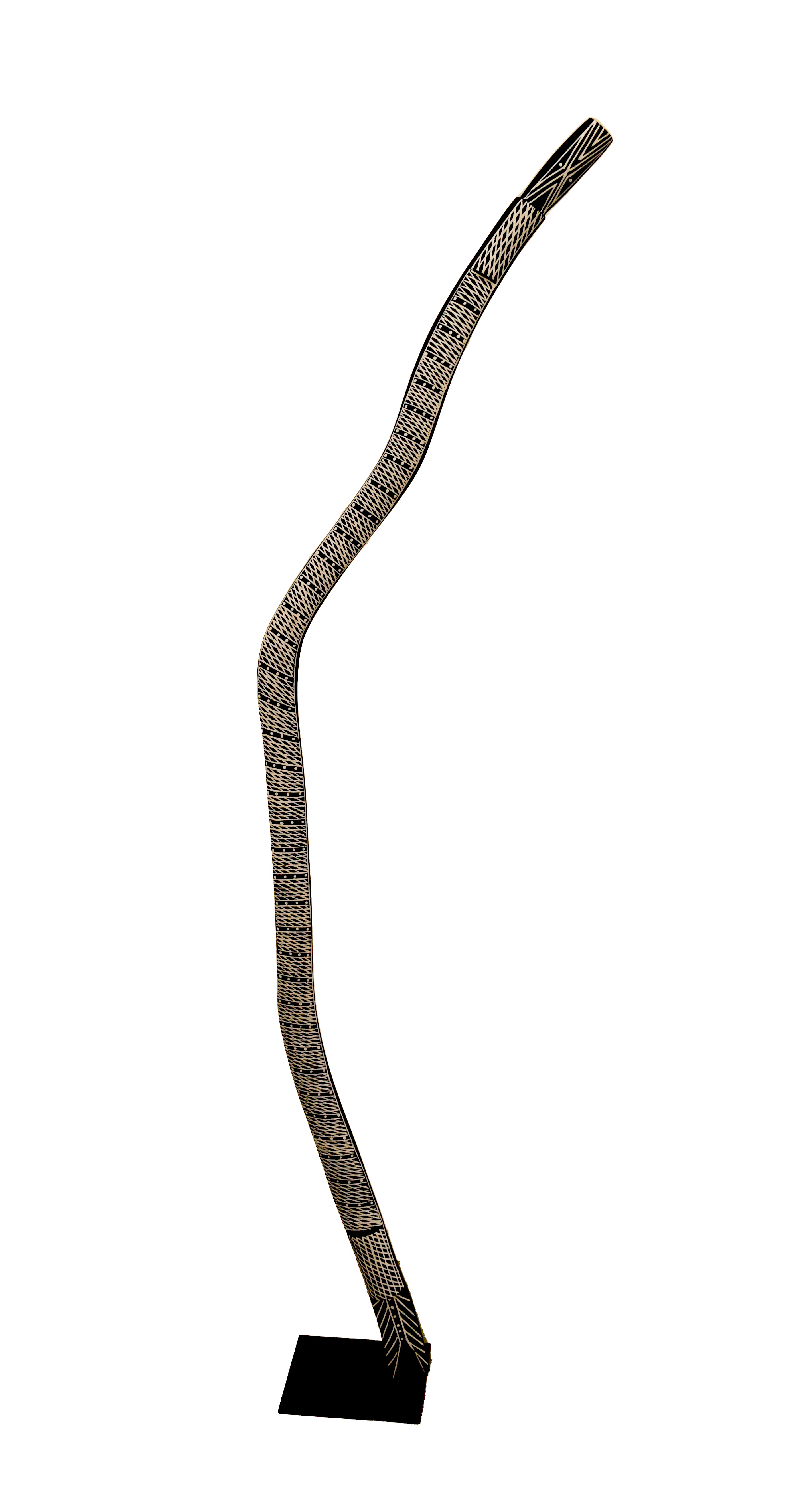 With this work, Joy Garlbin evokes one of the very powerful mermaid-spirit sisters found in her region: Djomi. She is a freshwater mermaid, while her sister Babbara is a saltwater mermaid. Their mother is a crocodile who lives in the Bábbarra water body. The two sisters have such strong powers that they can impregnate anyone who drinks from Bábbarra, even men. Their prodigious strength even allows them to attract rain and hurricanes to Bábbarra. A good way for apprentice fishermen not to mistake a barramundi fish for a mermaid is to spot white hairs on the fish, in which case it is a mermaid!