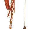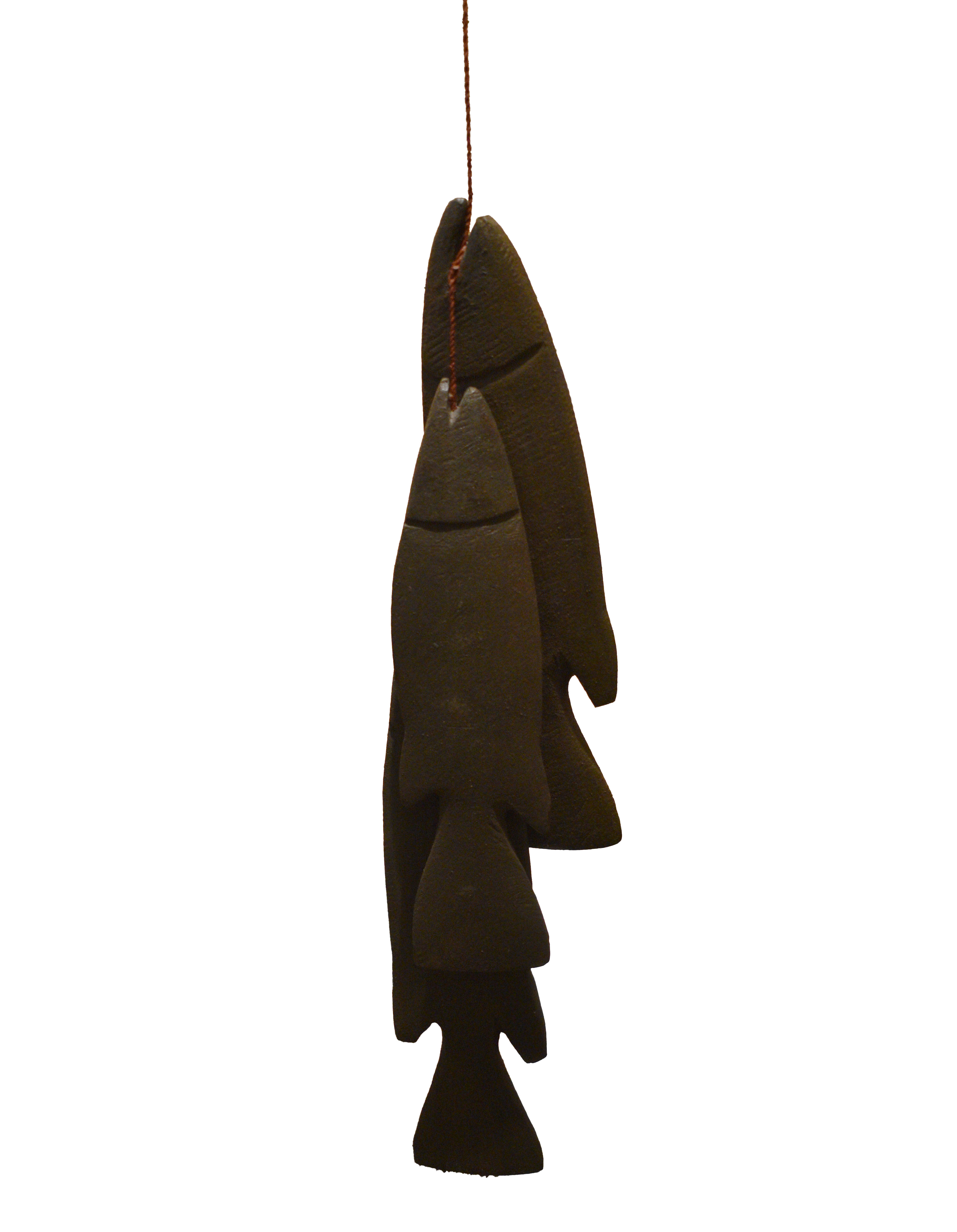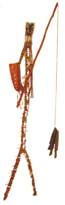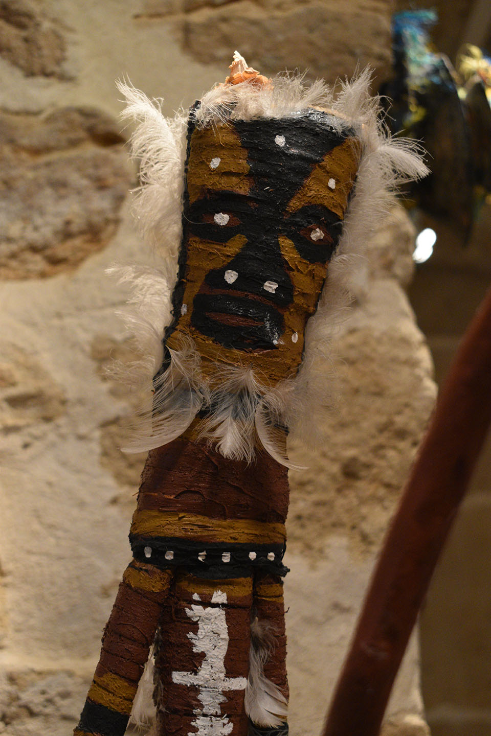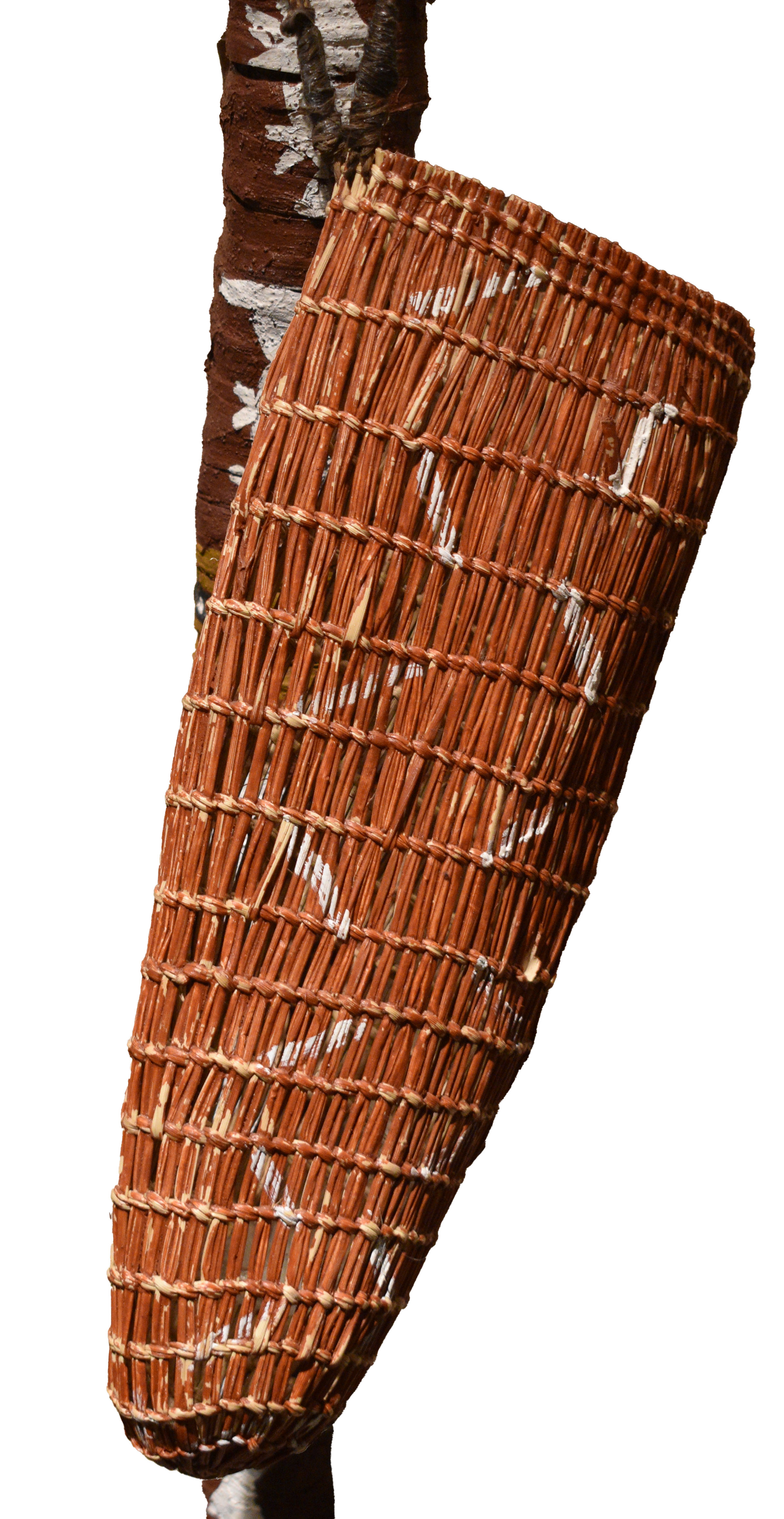 Originally from Central Arnhem Land, Bob Burrawal belongs to the artistic community of Maningrida, famous for the quality of its painted bark, wood carvings and remarkable work with plant fibres. This sculpture by Bob combines fibres and feathers and evokes the rituals celebrated to increase the number of certain animal species that his community feeds on. To this end, the Wurums, half-human, half-fish spirits, are called upon. It is said that they sometimes have fins on their legs and carry fish in woven bags. If the artist's family wants to have a bountiful catch, its members paint a Wurum on the side of a tree and then perform an incantation. The next day, the catch is supposed to be better.