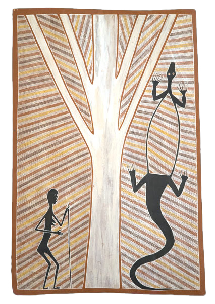 On the right is Gachalan, the water goanna (varan) whose story is closely linked to that of the Two Sisters.