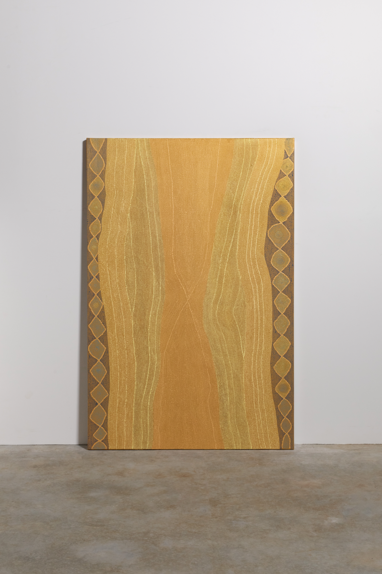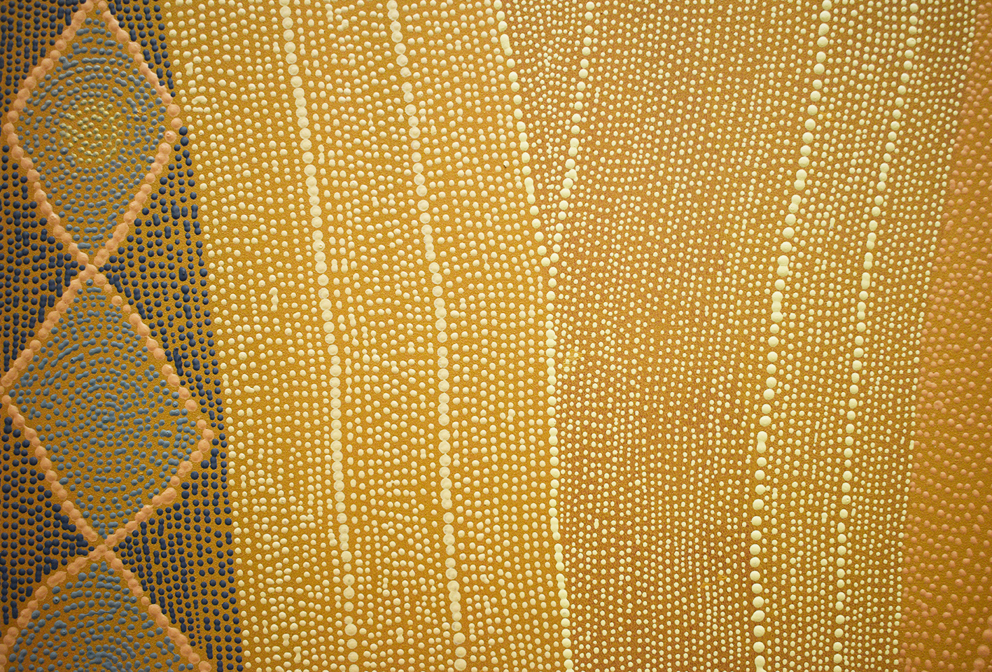 In Light, Niah McLeod's techniques are showcased. The assortment of yellow hues serves as the foundation for a play of finely dotted lines, whose varied spacing and density add a sense of movement to her delicate and intricate compositions. Niah's artistic practice is deeply meditative, and she compares the sensation of painting her dotted lines to steady breaths. The iridescent shades of the paints capture and reflect the light, dancing in peaceful symbolism.