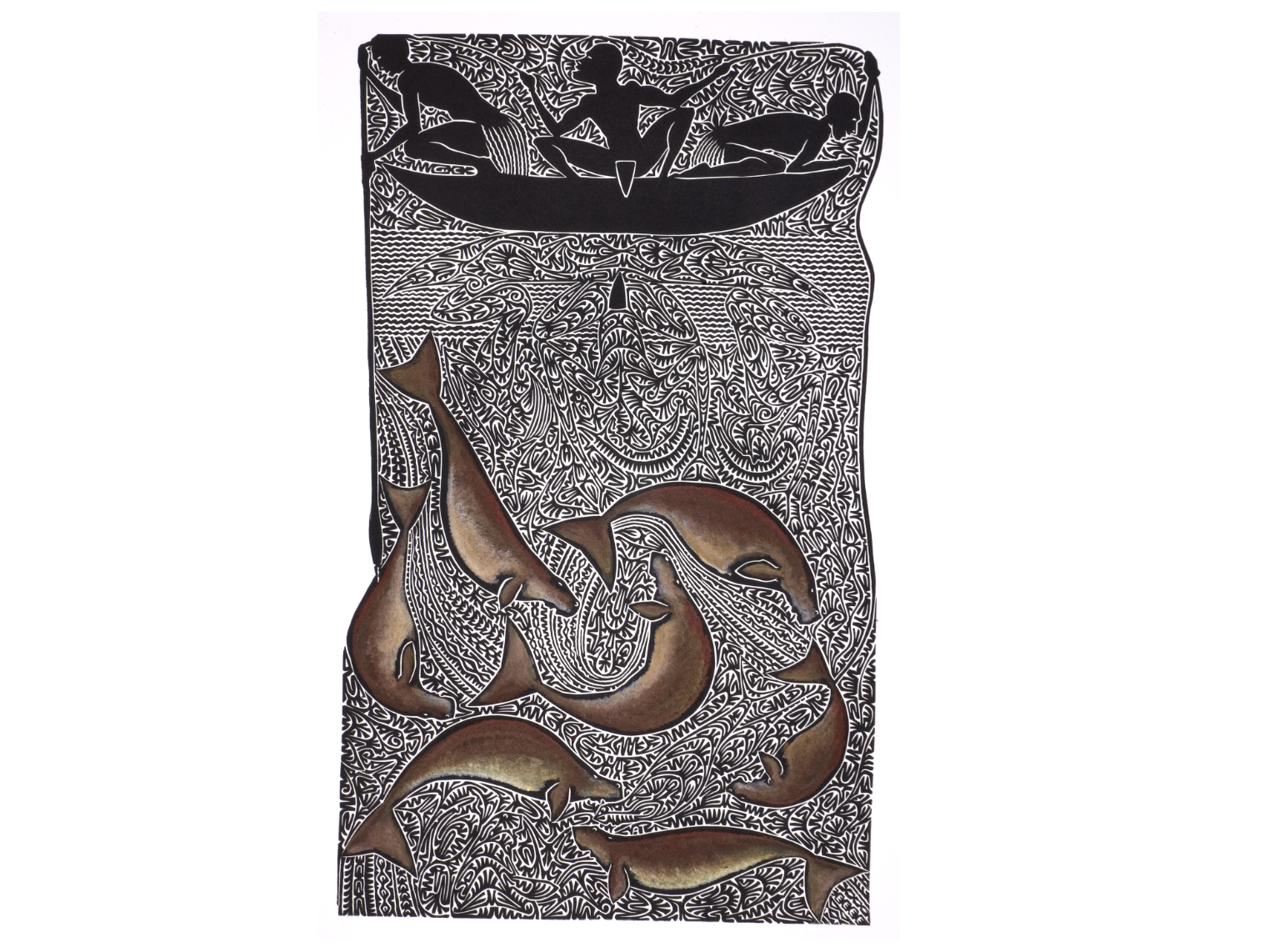“Nudaik refers to a traditional hunting practice of the Maluiligal (inhabitants of the Torres Strait). When a manatee has been harpooned, a rope is tied around its tail, and it is then used as bait. By shouting, it sends sound vibrations through the water. This attracts other manatees. When another animal is targeted, the hunters repeat the operation using the wap (harpoon), kuyur (arrow), and amu (rope). This engraving also shows the spiritual connection between the hunters and their food source. The hunters' reflections are slightly different from their silhouettes in the dugout canoe. When they come into contact with the ancestral spirits of the past, these reflections become the spirits of the aquatic world that guide the manatees and choose the best and healthiest among them." Alick TIPOTI
