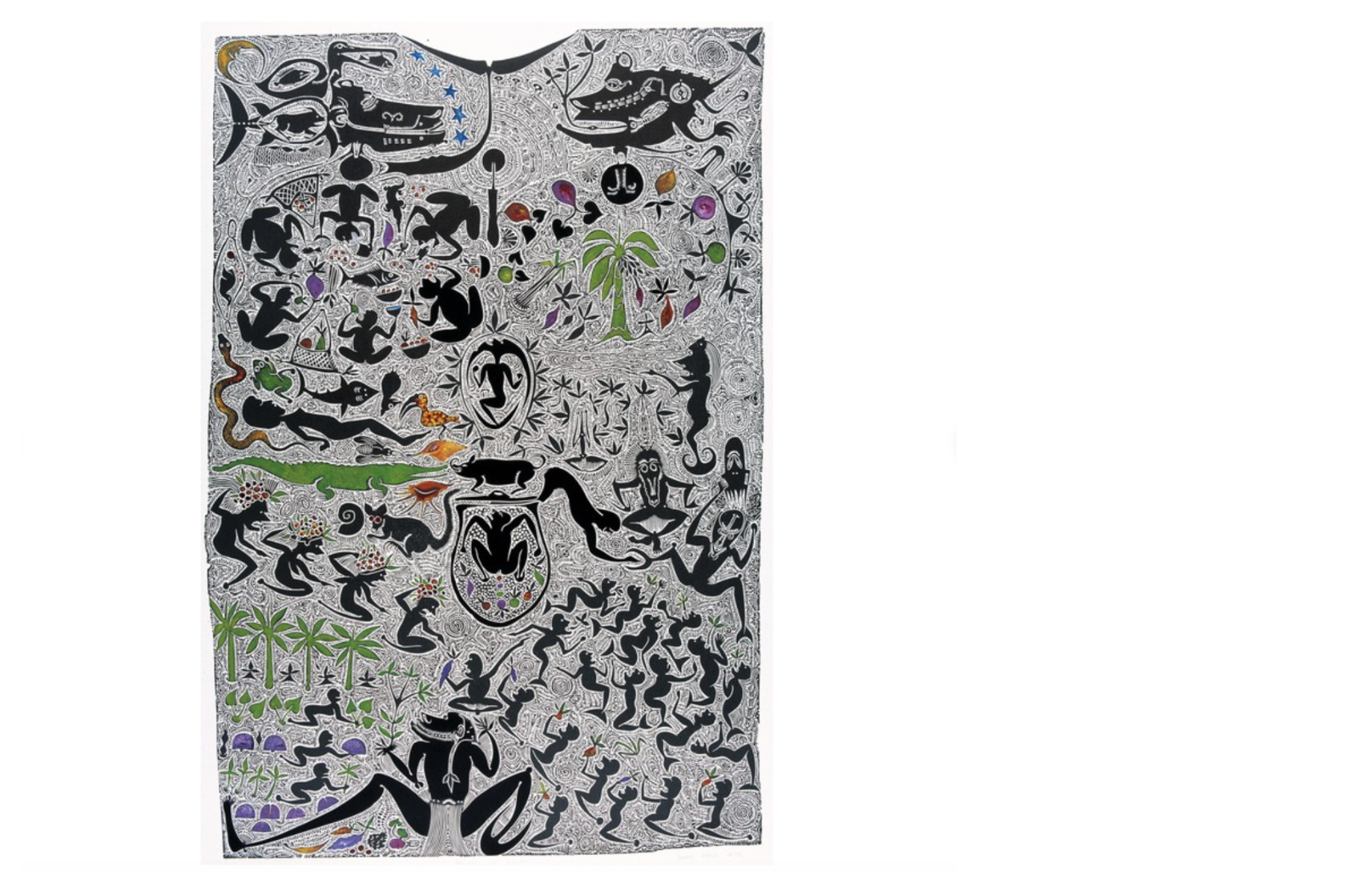 This linoprint by Dennis Nona recounts the different episodes of a legend dear to his people. In the time of Kupuna (the era of the ancient spirits), Tantanu (the creator) promised his grandchildren he would teach them how to accomplish a task without physically performing it.