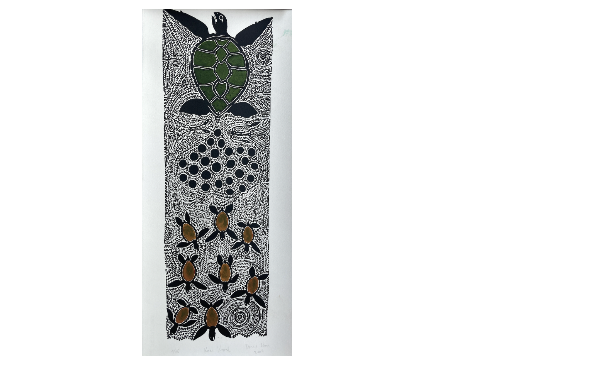 Waru Kazil is based on the concept of survival. This term refers to small turtles and the new generation that is arriving. Dennis Nona wanted to work on the theme of turtles, which seem to have disappeared from the small island of Badu, without anyone really knowing why. Hunting is still practiced excessively and it is becoming difficult to find turtles. Many are now on the mainland where they have survived, but they are becoming scarce on the island. In the engraving, we see them fleeing the island. We must rediscover the old laws in order to try to preserve the turtles. Humans have abused the situation, but our great-grandchildren's generation will see the turtles return.