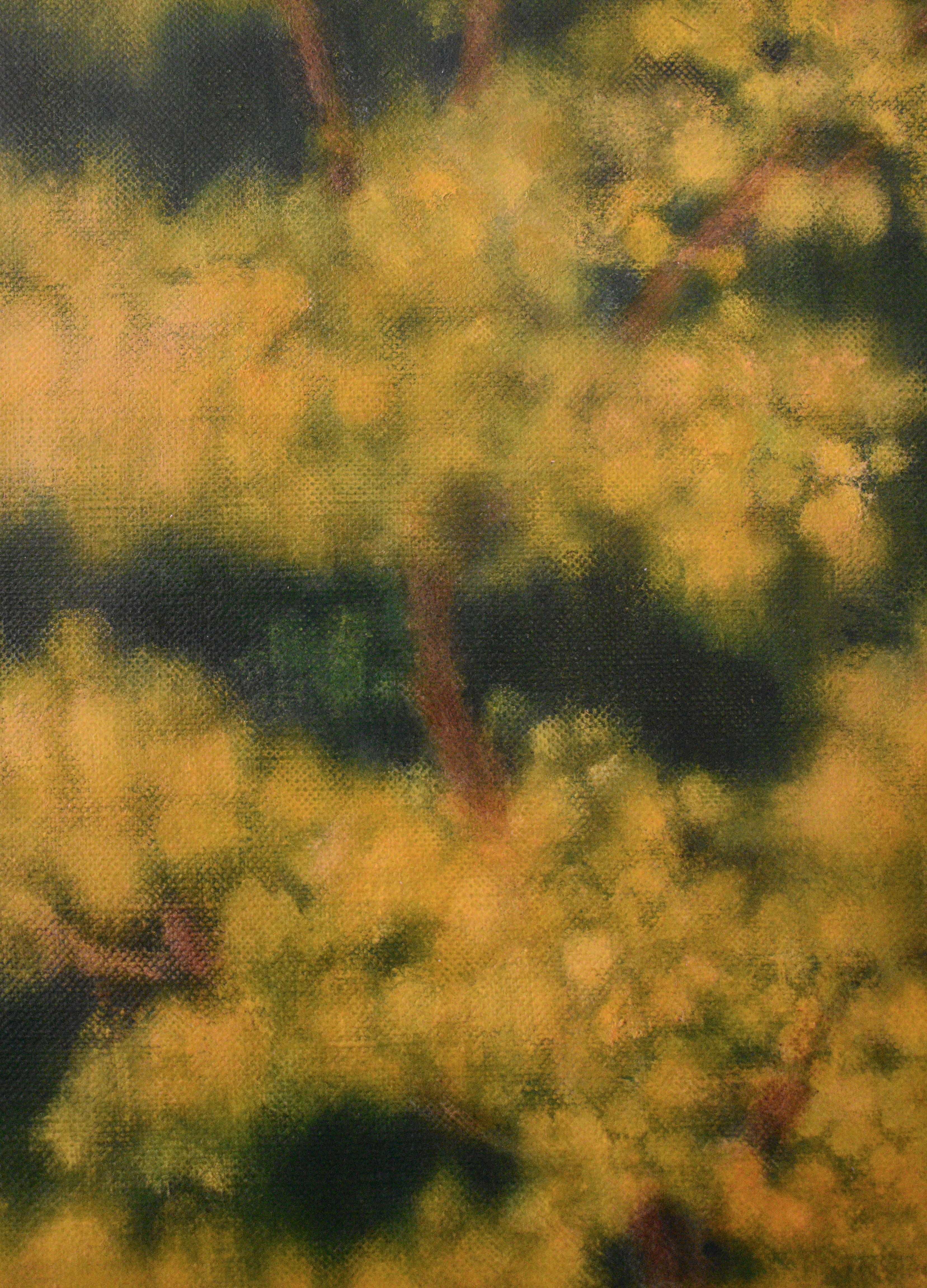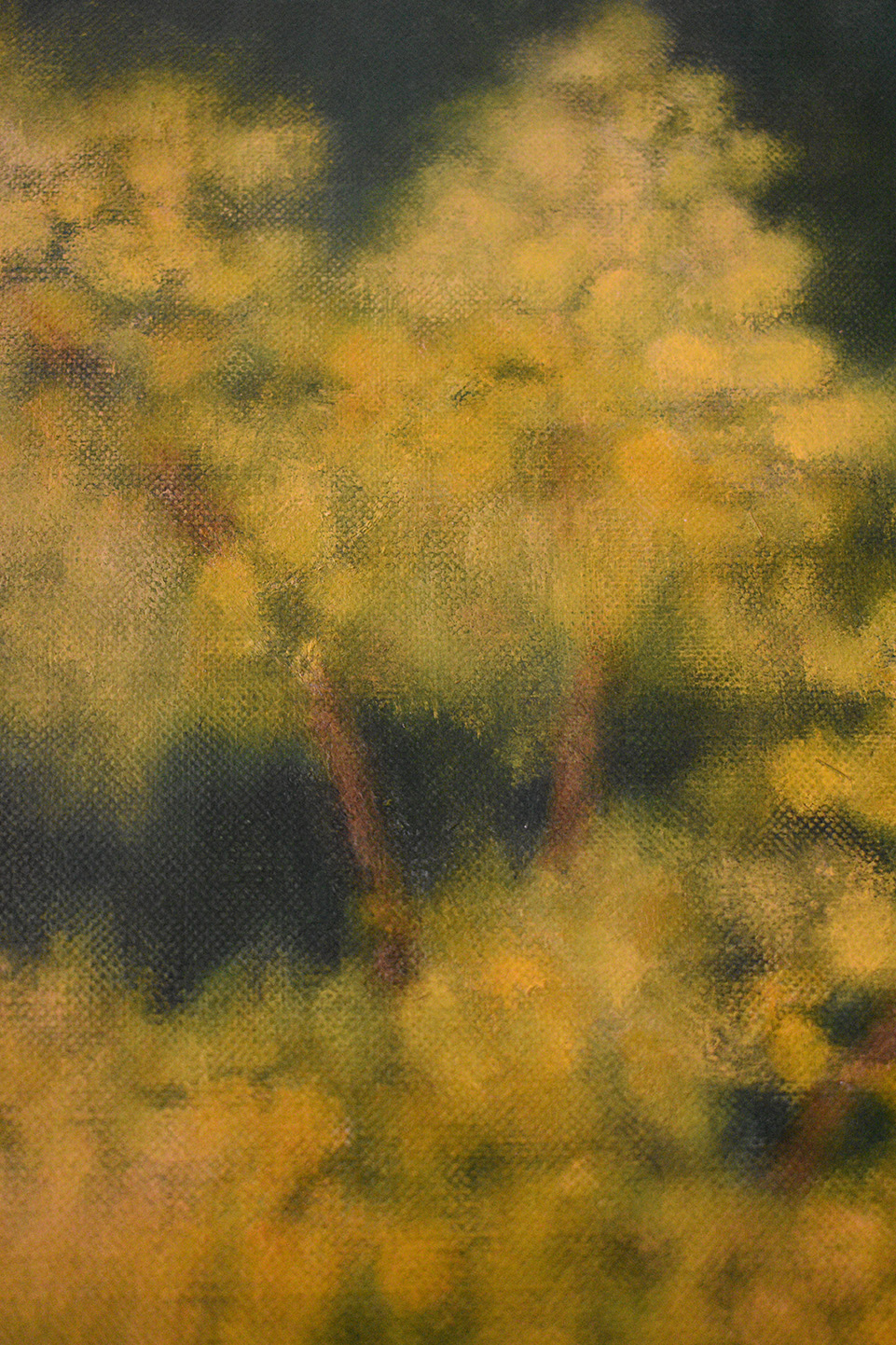 Executed in oil on canvas, the painting appears strikingly realistic from a distance, yet up close reveals a soft, sfumato-like surface, where subtle blurring and layered textures convey the delicacy and materiality of the blossoms.