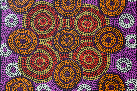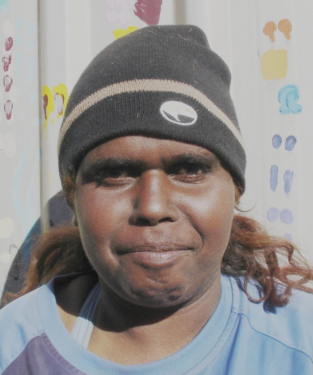 La peintre aborigène Debbie Brown vit dans la communauté de Yuendumu, à 250 kms au nord-ouest d’Alice Springs. Elle est une des “gardiennes” du lieu où pousse la tomate du bush et à ce titre, il lui incombe d’accomplir les rituels qui doivent maintenir la fertilité du site concerné : pour communiquer à la terre une force spirituelle qui soutiendra la croissance des végétaux, l’artiste et les femmes de son groupe clanique s’appliquent des peintures corporelles, chantent et dansent au cours de cérémonies sacrées dites “awelye” au cours desquelles on peint aussi le sol en recourant à la technique des pointillés caractéristique de l’art pictural du désert central que Debbie Brown reprend ici.