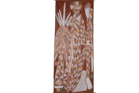 Né en Terre d’Arnhem sur la côte septentrionale de l’Australie, Samuel Namunjdja appartient à la communauté artistique de Maningrida située au centre de cette région et célèbre pour sa production d’écorces d’eucalyptus peintes à l’aide de pigments naturels. A l’origine, ces productions servaient dans les rituels initiatiques à transmettre les secrets hérités du Temps du Rêve aux nouveaux membres adultes de la tribu en s’inspirant des dessins préhistoriques ornant les parois des grottes et rochers sacrés de la région. Tout en gardant cette origine religieuse, les écorces ont commencé à être réalisées à l’intention de collectionneurs et sont devenues ainsi de véritables œuvres d’art produites indépendamment d’un contexte rituel précis.