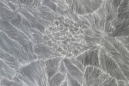 L’artiste a composé ses toiles de façon très subtile en faisant usage d’un vocabulaire iconographique très riche. En effet, des myriades de pointillés jouxtent des cercles concentriques eux-mêmes entourés de lignes très fines de peinture blanche subtilement apposées sur la toile à l’aide d’une aiguille sortant d’une bouteille de peinture. Bien qu’elle ait été formée par les plus grandes artistes aborigènes, Annie Petyarre a créé un style organique totalement unique. Ses toiles incarnent l’énergie de l’éclosion des fleurs, symbole de fertilité par excellence.