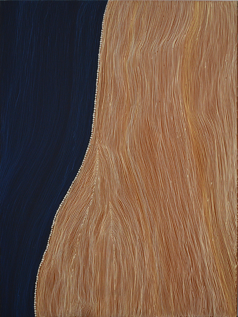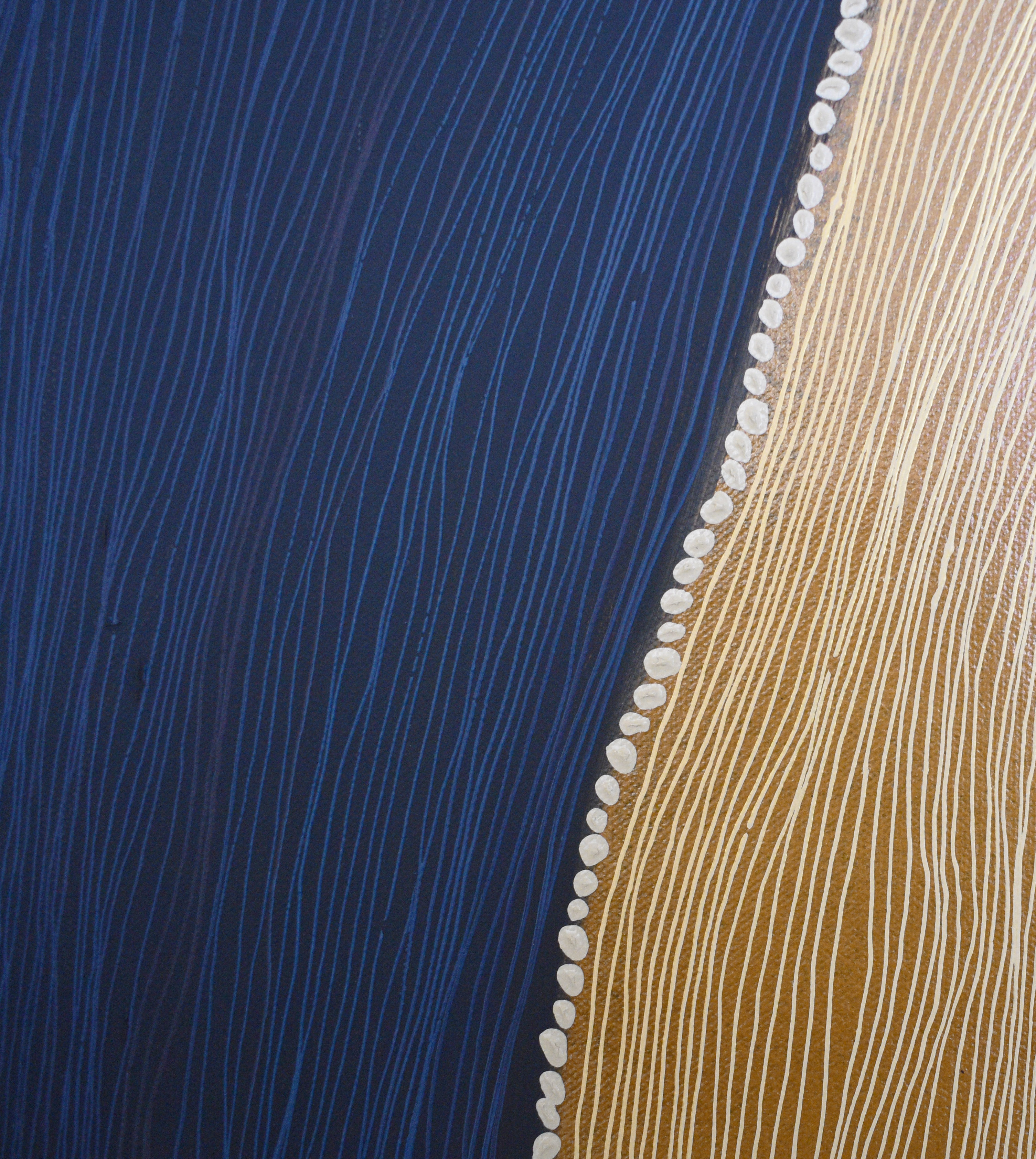 Niah représente la pluie qui ruisselle sur les troncs d’eucalyptus, conjuguant poésie et sensations. À l’aide d’une pipette ou d’une épine d’échidné, elle trace des lignes fluides et sinueuses, rappelant à la fois le ruissellement de la pluie sur l’écorce et les méandres de la mémoire. Les reflets irisés de la peinture renforcent la sensation de mouvement et de lumière filtrée par la canopée, insufflant à l’œuvre une vibration quasi vivante.