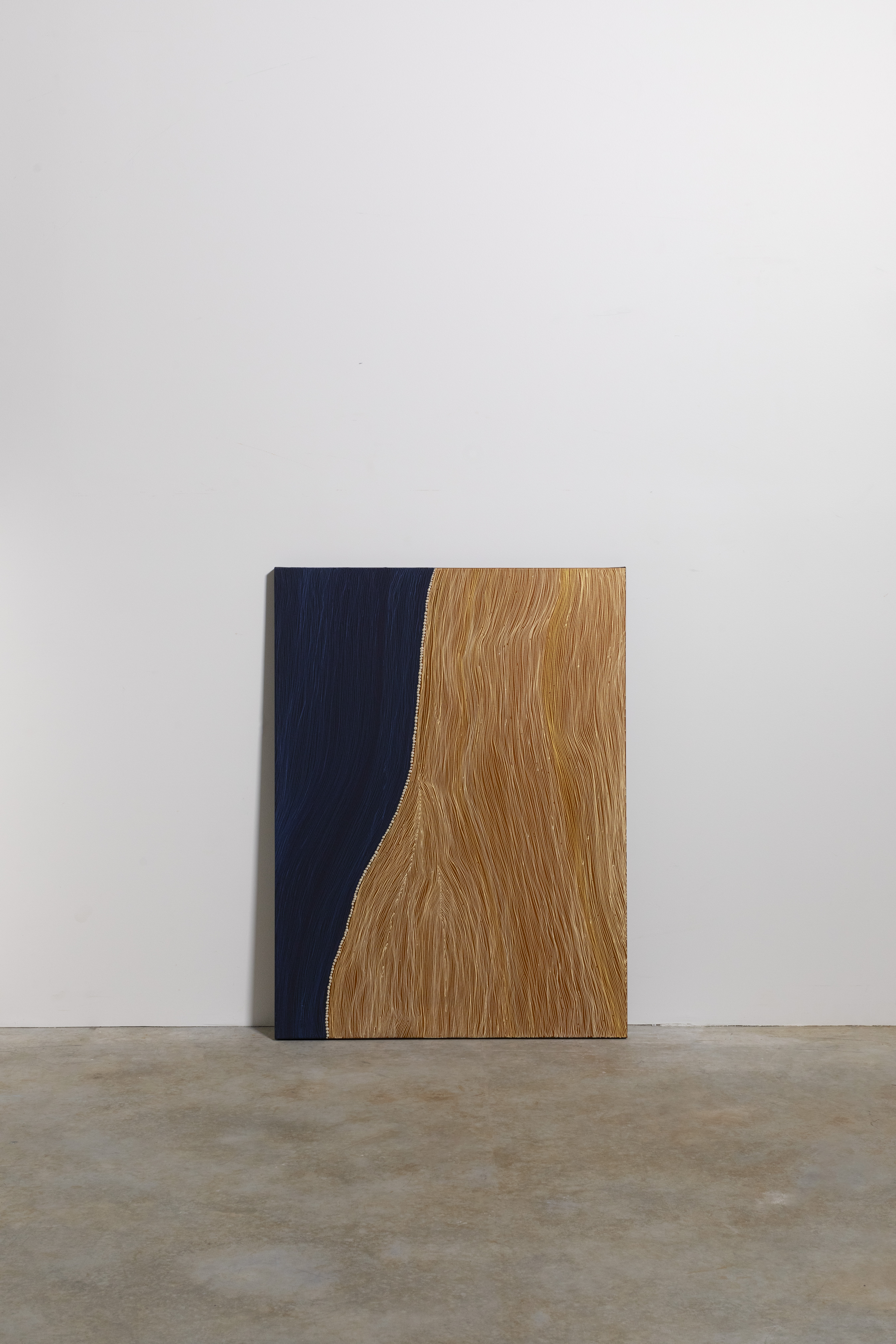 La série Bana Gugaa Waraawara de Niah Juella McLeod est profondément enracinée dans le territoire et la mémoire familiale. Son titre, que l’on peut traduire par « Pluie sur l’écorce filandreuse avec ligne de pêche », invite à plonger dans une scène à la fois sensorielle et émotionnelle, ancrée dans les paysages humides de la côte sud-est australienne, là où pousse l’eucalyptus capitellata, surnommé Stringy bark pour la fibre caractéristique de son écorce. Sous la pluie, protégée par la majesté des grands eucalyptus, l’artiste évoque les souvenirs de pêche partagés avec son grand-père. L’air y est saturé d’humidité, imprégné de la puissante odeur de l’eucalyptus mêlée à celle de la terre mouillée.