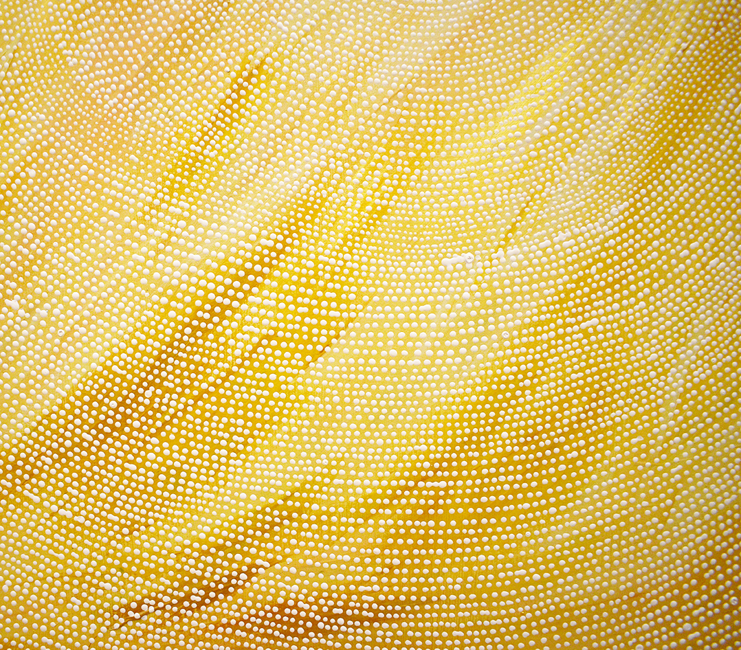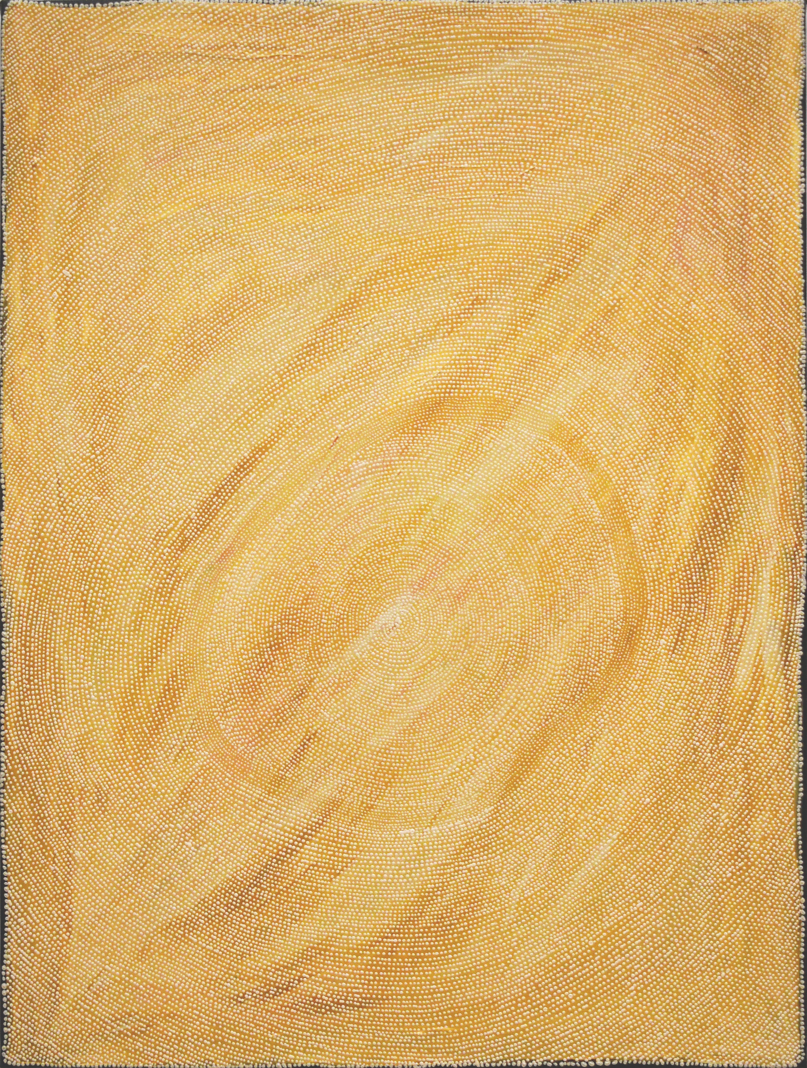 Le lac Swan, habité par les grenouilles, résonne des échos de leurs coassements, créant une atmosphère à la fois mystique et rituelle. Niah saisit cette essence en composant sa toile avec de petits points en relief, appliqués à l’aide d’une pipette. Ces points réguliers et hypnotiques forment un motif qui évoque la propagation d’ondes à travers le territoire, comme autant de perles délicatement brodées sur la surface.
