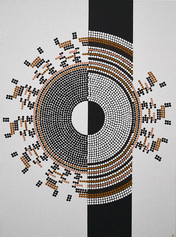 Dans Quadroon, issue de The Caste Collection, Konstantina dénonce la violence symbolique des classifications raciales coloniales en Australie, notamment le terme « quadroon », qui réduisait l’identité aborigène à une fraction de sang. En fragmentant la toile selon une logique mathématique, elle rend visible l’absurdité et l’oppression de ces hiérarchies imposées. Artiste aborigène Blak*, militante et mère, Konstantina transforme ce « un quart » prétendument mesurable en espace de résistance, affirmant que l’identité ne peut être ni diluée ni quantifiée. L’œuvre déconstruit toute vision binaire et fait du langage de la domination un acte de réparation politique et visuelle : le Blak demeure indivisible.