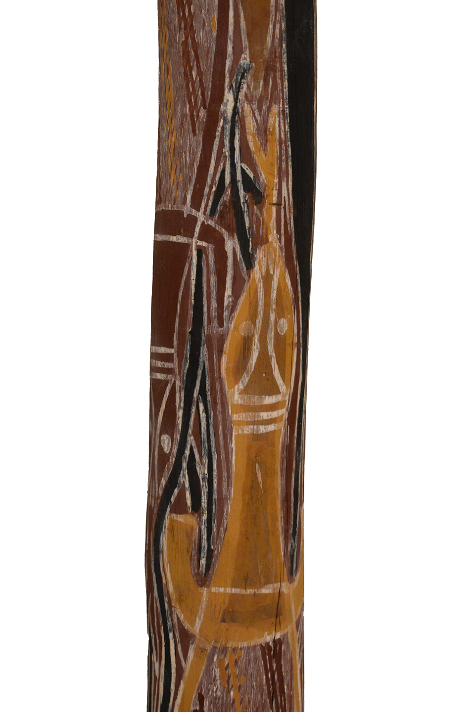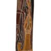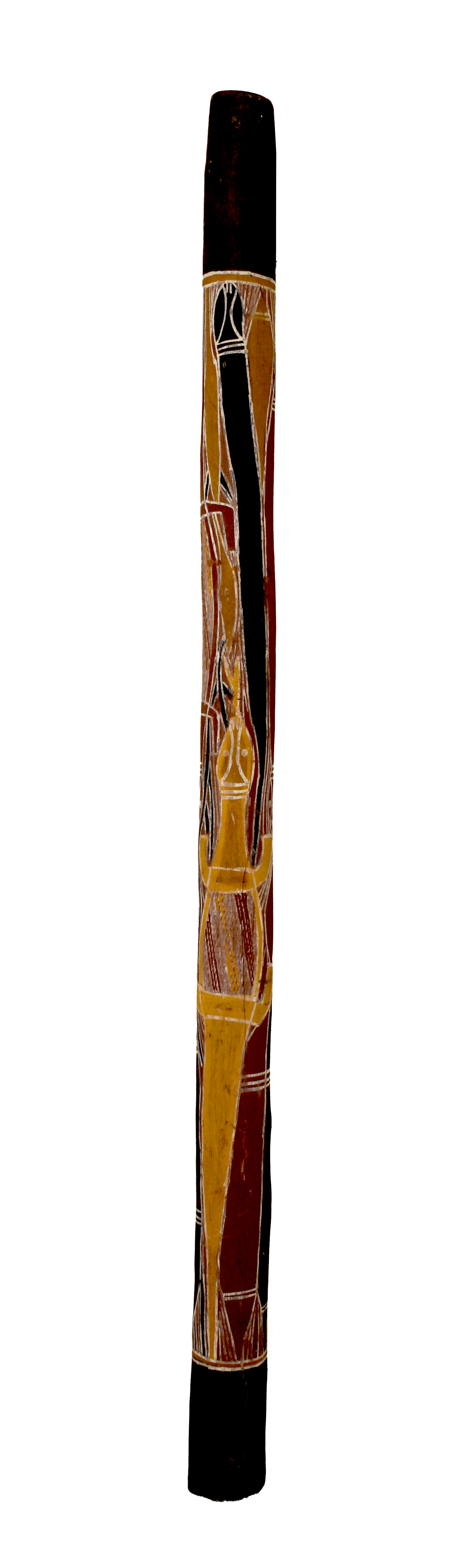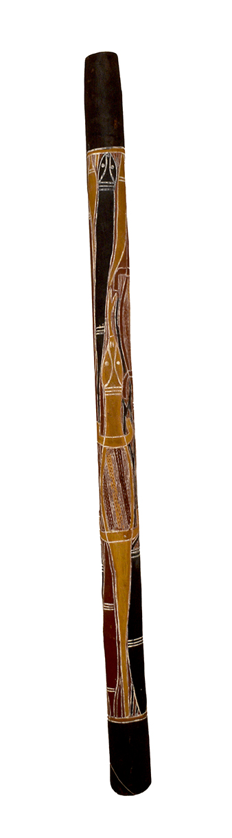 Didgeridoo (possiblement un mago) réalisé dans du bois d’eucalyptus creusé naturellement par les termites, en provenance du Nord de Australie, dans la région de la Terre d’Arnhem Trompette naturelle emblématique des peuples aborigènes, le didgeridoo produit un bourdon* grave et continu grâce à la vibration des lèvres et à la respiration circulaire. Le mago désigne une forme spécifique, plus courte et cylindrique, originaire de l’ouest de la Terre d’Arnhem. L’instrument présenté ici est identifié comme un didgeridoo, sans exclure qu’il puisse s’agir d’un mago.