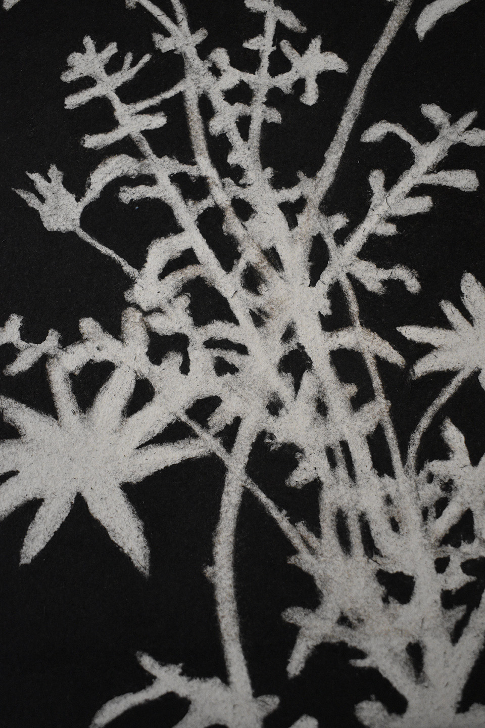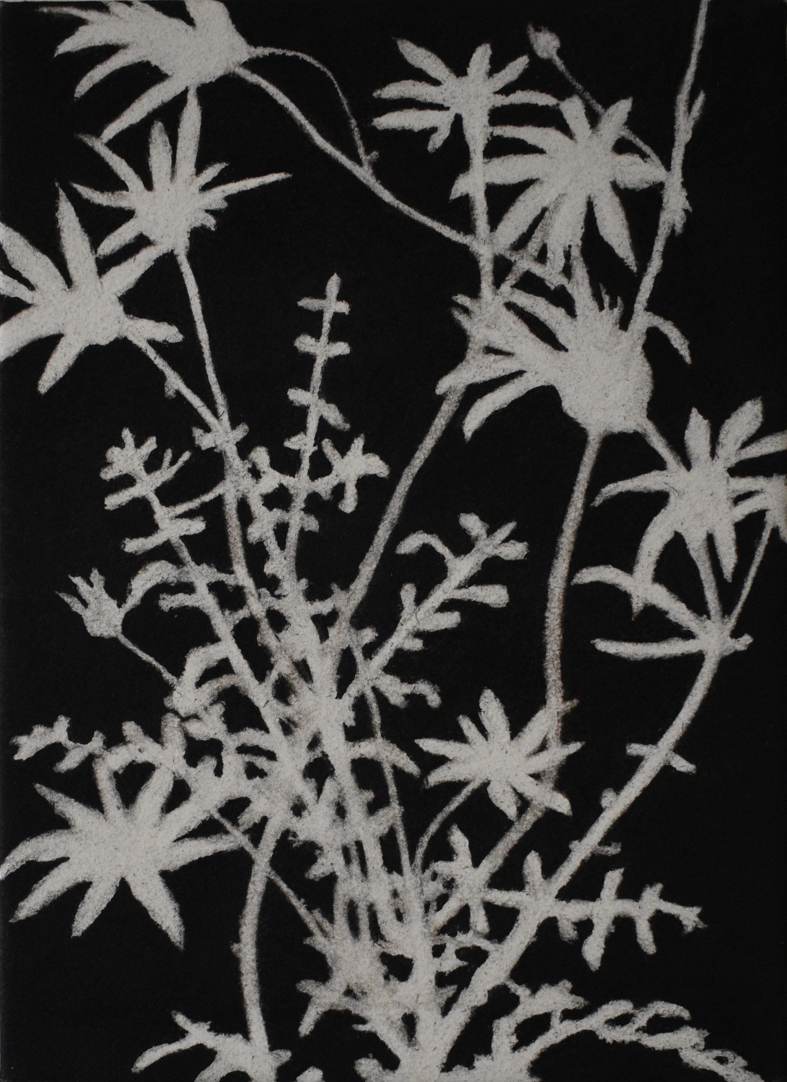 Réalisée au fusain sur papier, l’œuvre fait surgir la forme des fleurs à travers des contours noirs qui en définissent le volume et la silhouette, donnant à chaque pétale sa propre expression. À la manière d’une ombre chinoise, la silhouette végétale se révèle par le contraste entre le noir et le blanc, ou se retire de son environnement, laissant derrière elle l’empreinte de son absence tracée par ses contours. Cette technique évoque les cyanotypes, tandis que la texture vaporeuse du fusain accentue la dimension sensible et poétique de l’œuvre. Jennifer Keeler-Milne saisit ainsi la légèreté des pétales et la délicatesse de la flore, offrant une célébration contemporaine et intimiste de la nature australienne.
