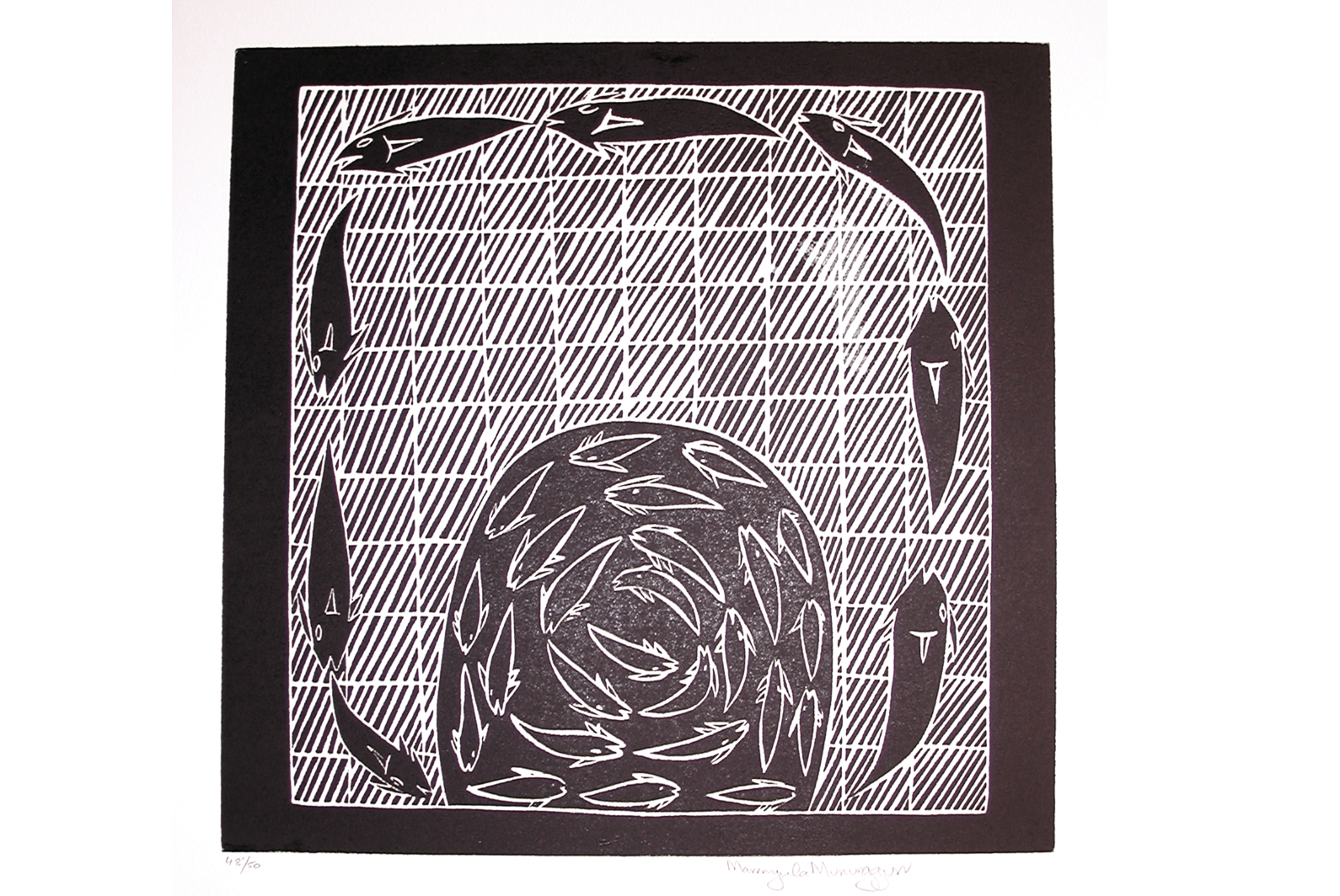 Les poissons que nous attrapons sont le Gannal (poisson-chat) et le Dhunum (sleepy cod). Les lignes en arrière-plan représentent l’eau douce à Wandawuy. La cérémonie du Dhangi appartient aux habitants de Wandawuy. Ce savoir se transmet de génération en génération. Il représente la saison, le lieu, la tradition et les connaissances préservées par tout le clan Djapu.