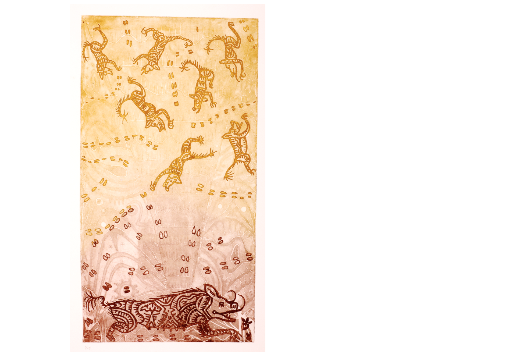 Les habitants de l’ile de Badu utilisent des meutes de huit à dix chiens qui passent parfois des heures à chercher un sanglier. Lorsque l’un d’entre eux part tout d’un coup en courant, cela veut dire qu’il a flairé un sanglier. C’est ce moment précis que l’artiste retranscrit dans son estampe.