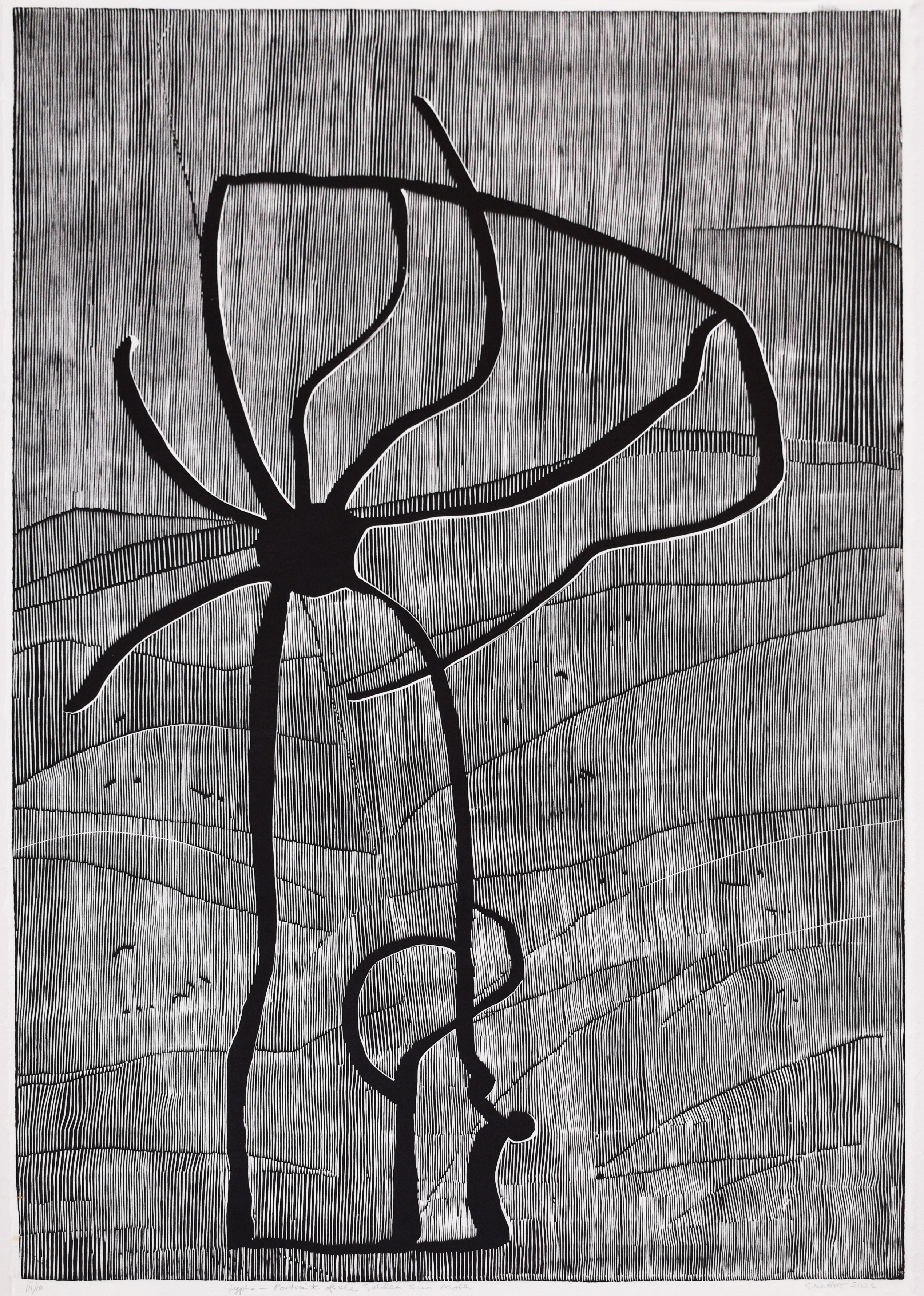 "Glyphs - Portrait of the Golden Sun Moth" est une linogravure sur papier Kozo de G.W. Bot, faisant partie de sa série Glyphs. L'œuvre présente une figure mystérieuse noire, entre soleil, arbre et araignée, qui rythme le paysage. Ce dernier est composé de stries délicates, évoquant des brindilles, qui accentuent l'aspect naturel et organique. La composition incarne une symbiose entre le monde animal et végétal, tout en plongeant dans une esthétique abstraite et énigmatique. Un hommage visuel à la beauté subtile de la nature australienne.