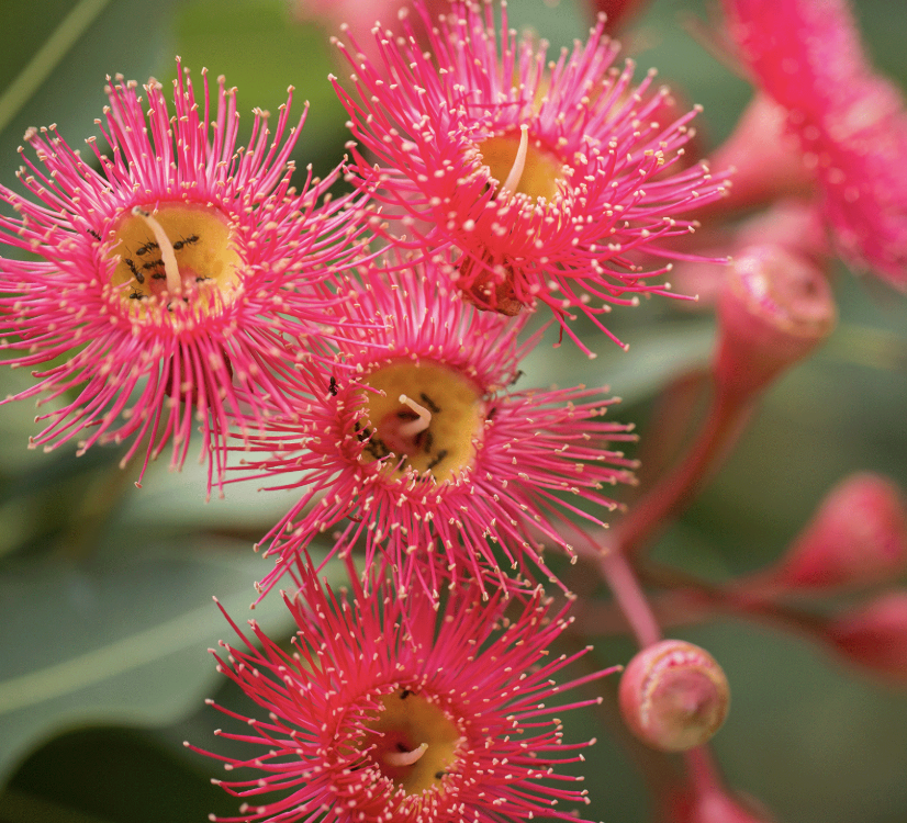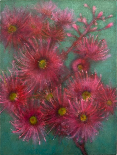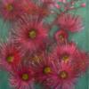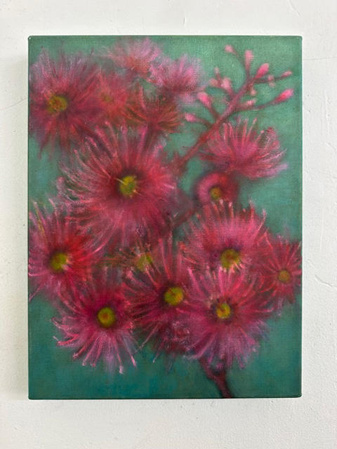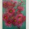 Dans cette peinture, l’artiste représente une branche de fleurs d’eucalyptus, ou gum blossoms, plante originaire d’Australie. Ces fleurs, reconnaissables à leurs étamines roses délicates, symbolisent en Australie la résilience et le renouveau, s’épanouissant dans des paysages souvent difficiles et se régénérant après les feux de brousse.