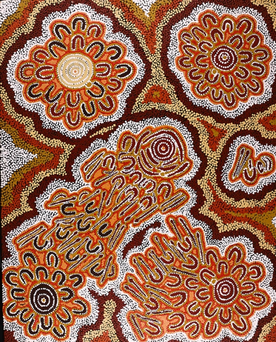 Au Temps du Rêve, les dasyures (sortes de “chats sauvages” : les “U” rouges sur la toile) quittèrent le centre du Désert vers le nord afin d’instaurer une cérémonie d'initiation sur le site de Warrungu. . Arrivés sur les lieux, ils fabriquèrent des lances puis l'un d'eux partit à la recherche d'un sac contenant divers objets rituels. A son retour, la cérémonie eut lieu mais les ancêtres “Chats” se heurtèrent aux opossums : au cours de leur combat, l’un des dasyures écrasa avec son boomerang la queue d’un opossum ce qui explique pourquoi, depuis, elle est aussi longue.