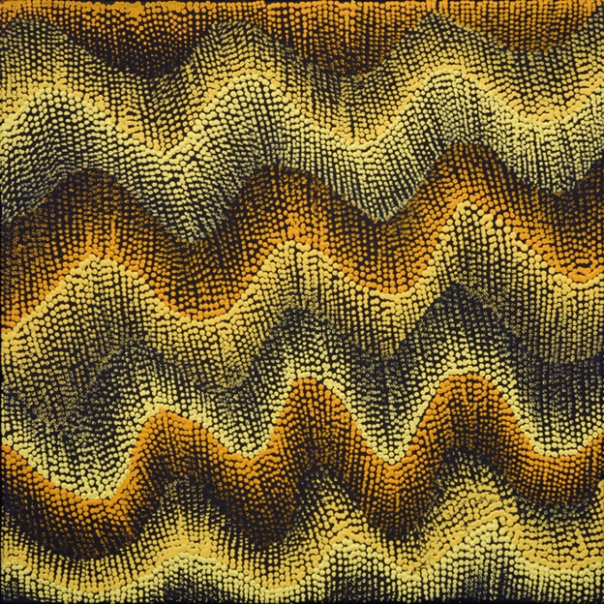 Originaire de la communauté de Yuendumu dans le Désert Central, Elizabeth Katakarinja représente avec cette toile le Rêve (Jukurrpa) de la Chenille (Jajutuma) qui est associé à Wapurtali (Mt. Singleton), un lieu sacré situé à l’ouest de Yuendumu.