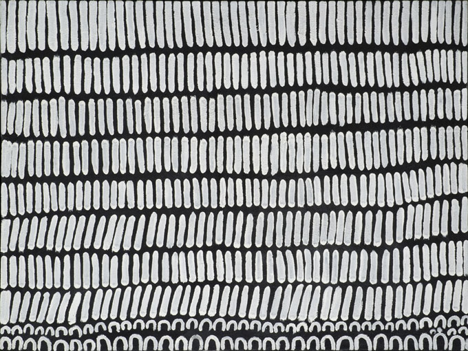 Cette œuvre en pigments naturels, noirs et blancs de Lena reprend deux des thèmes de prédilection de l’artiste aborigène Lena Nyadbi : celui du Jimbala qui symbolise le territoire sacré de son père au paysage rocheux dont les pierres saillantes sont utilisées pour fabriquer des têtes de lances, et les Lilmin (motifs en arc de cercle) représentant quant à eux les écailles de l’Ancêtre poisson Barramundi qui s’échappa d’une grotte où il avait été emprisonné au Temps du Rêve.Si les oeuvres des artistes de la communauté de Warmun se dénotent des autres communautés par un style abstrait représentant différents territoires sacrés, Lena Nyadbi ajoute dans sa toile aborigène un élément d’un mythe fondateur : celui de la fuite du Barramundi. En résulte un style unique qui a séduit de nombreux musées dont celui du Quai Branly à Paris dont l'architecte - Jean Nouvel - a choisi Lena Nyadbi pour habiller une de ses façades.Stéphane Jacob dirige la galerie Arts d’Australie • Stéphane Jacob. Expert en Art Aborigène (C.N.E.S.), co-auteur du catalogue des peintures aborigènes des collections du musée des Confluences de Lyon et de l'ouvrage "La peinture aborigène" aux nouvelles Editions Scala. Il est signataire de la charte d’éthique australienne Indigenous Art Code, il s’attache depuis 1996 à faire connaître l’art et les artistes australiens aborigènes contemporains d’Australie.