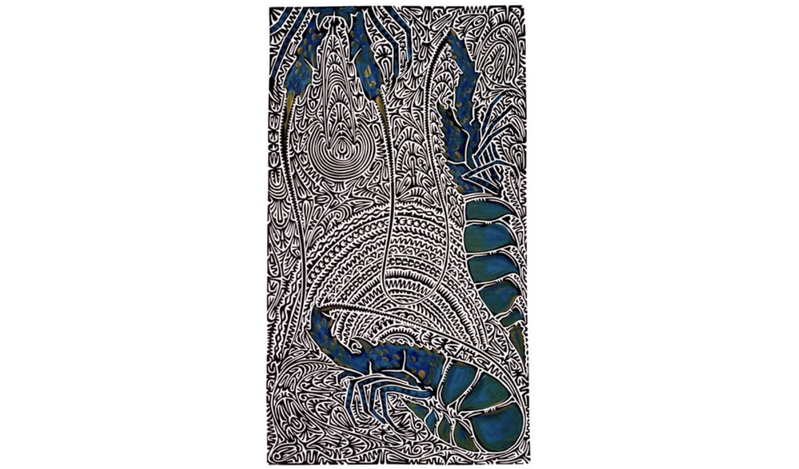 Ici ce sont les homards des rochers qui sont à l’honneur. Si, comme aime à le répéter l’artiste, la mer et les récifs du Détroit de Torres servent de salle de classe à son peuple, ses estampes sont également devenues un moyen d’enseigner les fondements de sa culture aux jeunes générations.
