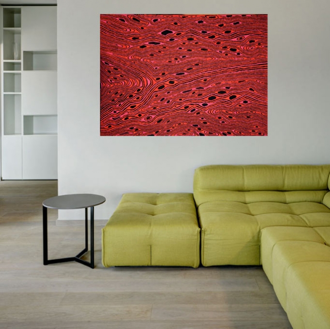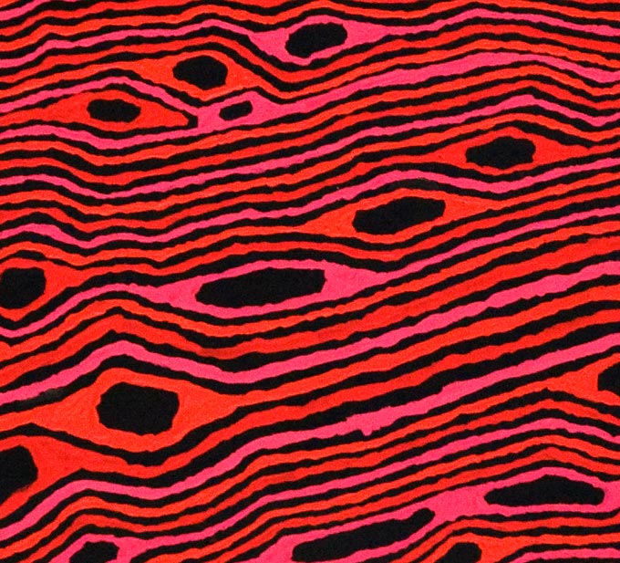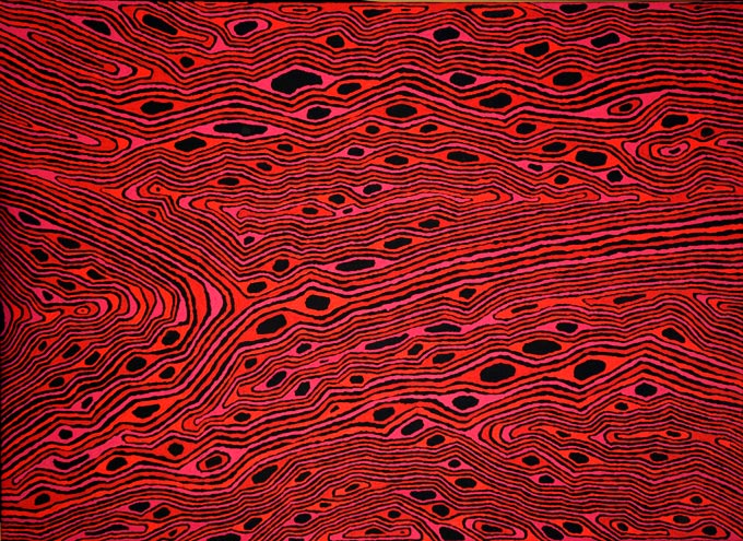 L'artiste peintre aborigène Gordon Robertson Jangala est le neveu de Dorothy Napangardi. Il traite ici d’un site sacré pour les femmes aborigènes de son clan lié à un épisode du Temps du Rêve (Dreaming) : Mina Mina. Il s’agit d’un territoire aride constellé de marais salés asséchés et c’est une vision satellitaire de celui-ci qui nous est présentée. Les tâches noires symbolisent les marais tandis que les lignes retranscrivent le mouvement des dunes au gré du vent. Cet effet d’optique rappelle que pour les Aborigènes, le Temps du Rêve n’appartient pas au passé, mais qu’éternel présent dont l’art et les rites religieux assurent la permanence, il est avant tout création continue et énergie.Stéphane Jacob dirige la galerie Arts d’Australie • Stéphane Jacob. Expert en Art Aborigène (C.N.E.S.), co-auteur du catalogue des peintures aborigènes des collections du musée des Confluences de Lyon et de l'ouvrage "La peinture aborigène" aux nouvelles Editions Scala. Il est signataire de la charte d’éthique australienne Indigenous Art Code, il s’attache depuis 1996 à faire connaître l’art et les artistes australiens aborigènes contemporains d’Australie.