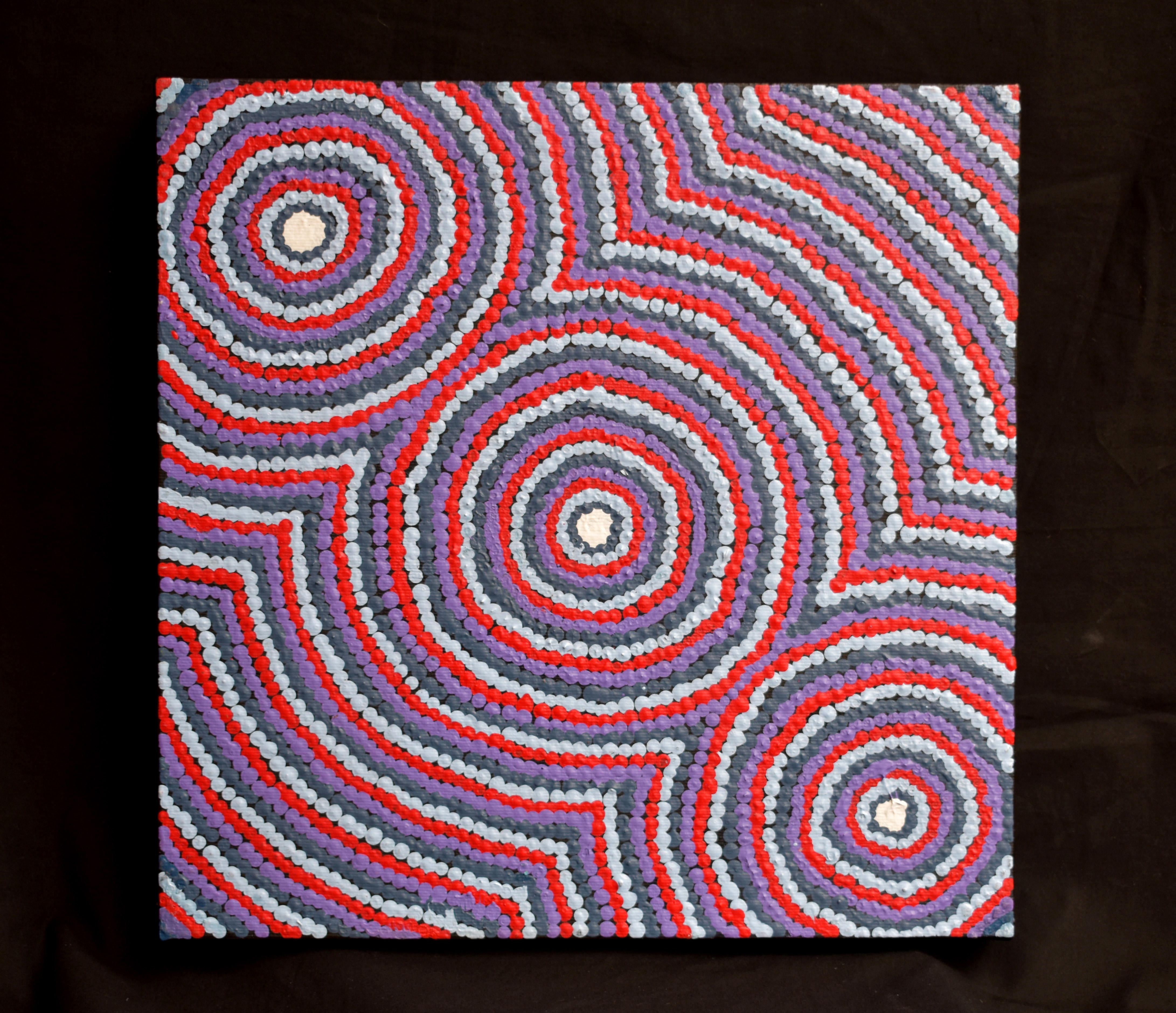 Originaire de Yuendumu dans le désert central australien, Virginia Sims évoque avec cette œuvre le Rêve de Mina Mina qui appartient aux femmes Napangardi et Napanangka, deux clans féminins du groupe des Warlpiri.