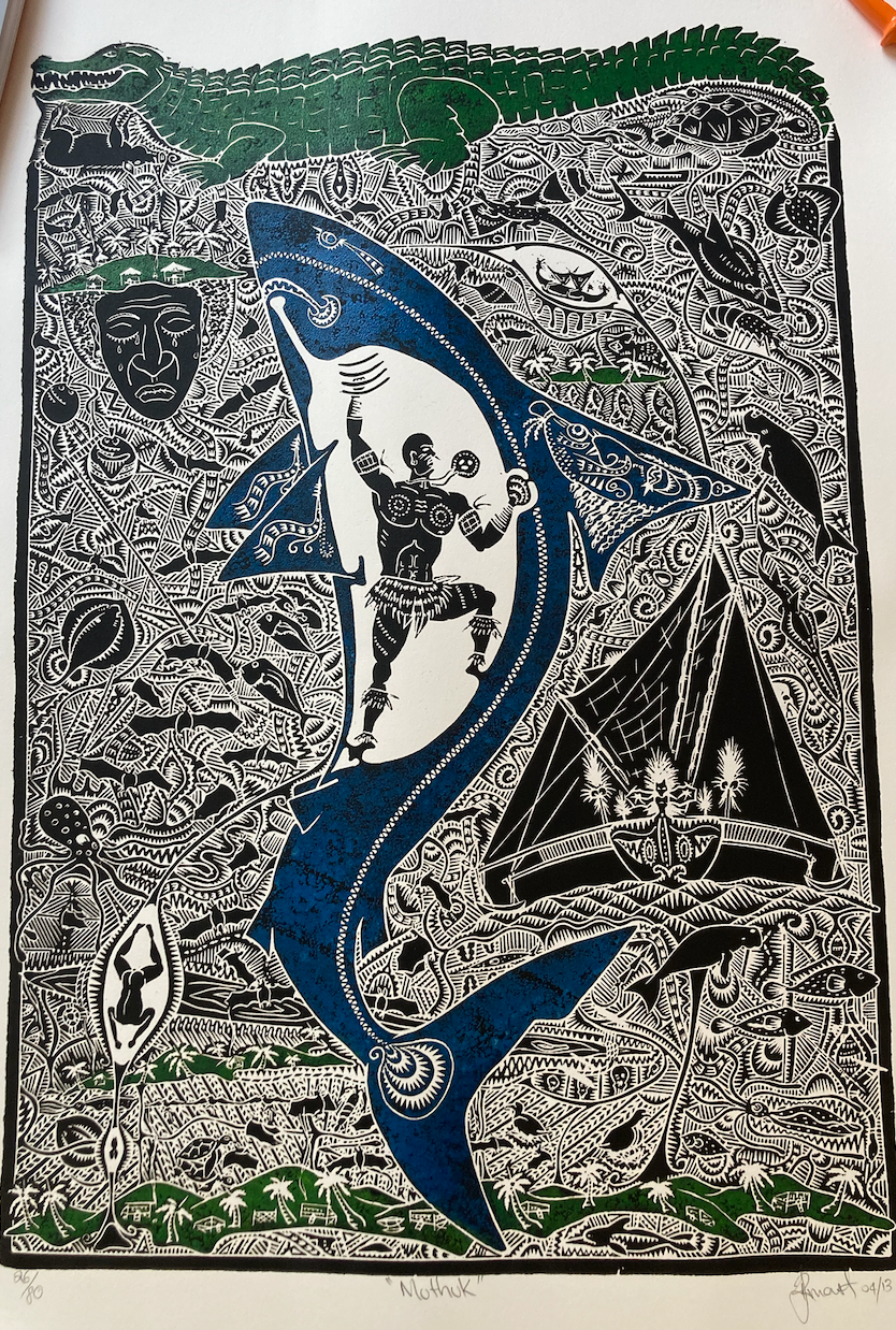 La linogravure de Robert Mast relate la légende de Muthuk, Chasseur et pêcheur aussi fameux qu’avare, condamné par les sorciers de son île de Badu.