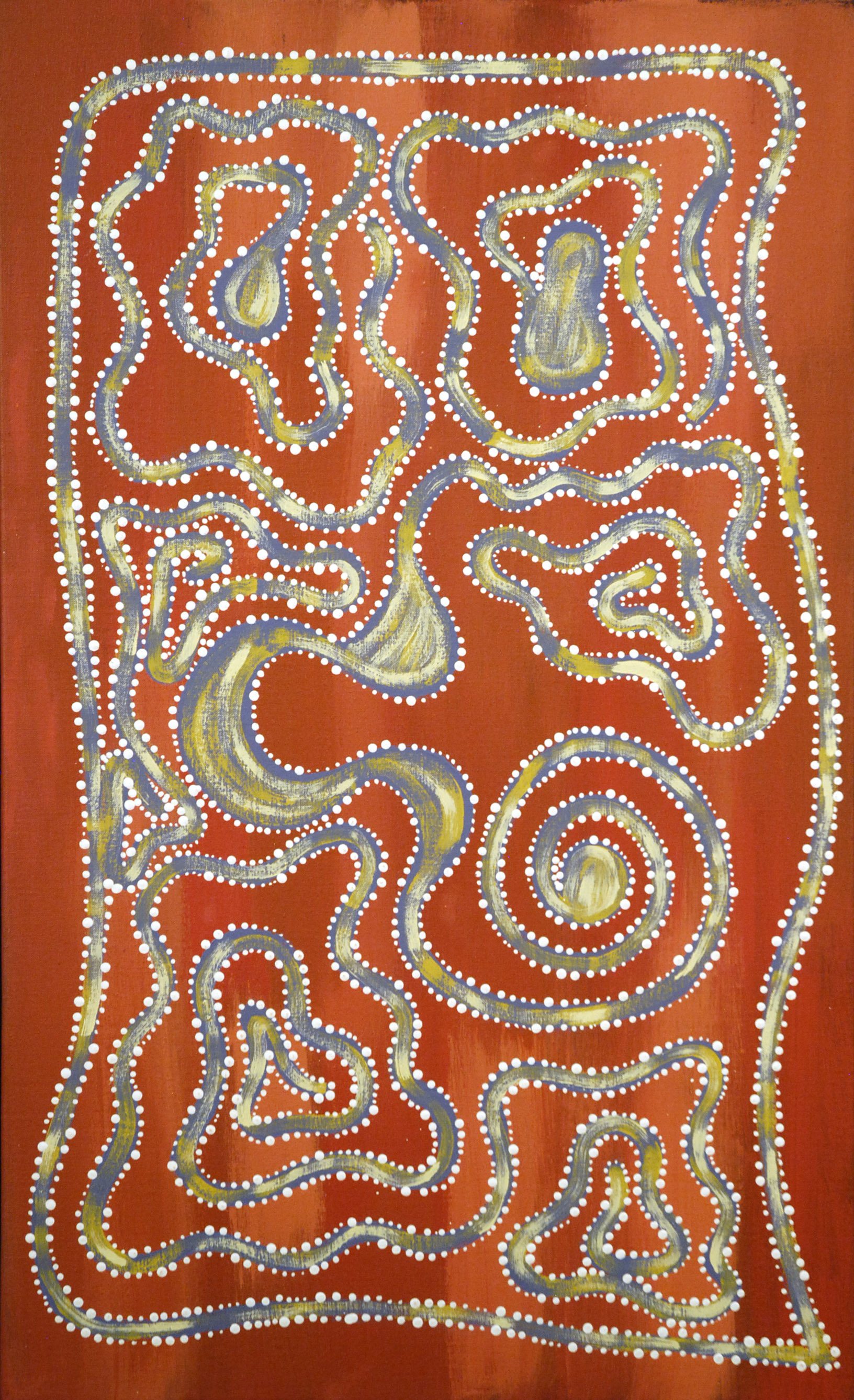 Originaire de Yuendumu dans le Désert Central, Stephanie Nelson évoque ici le Rêve de l’Eau lié au site de Mikanji, un cours d’eau, asséché la plus grande partie de l’année, dans lequel se trouvent des marécages.