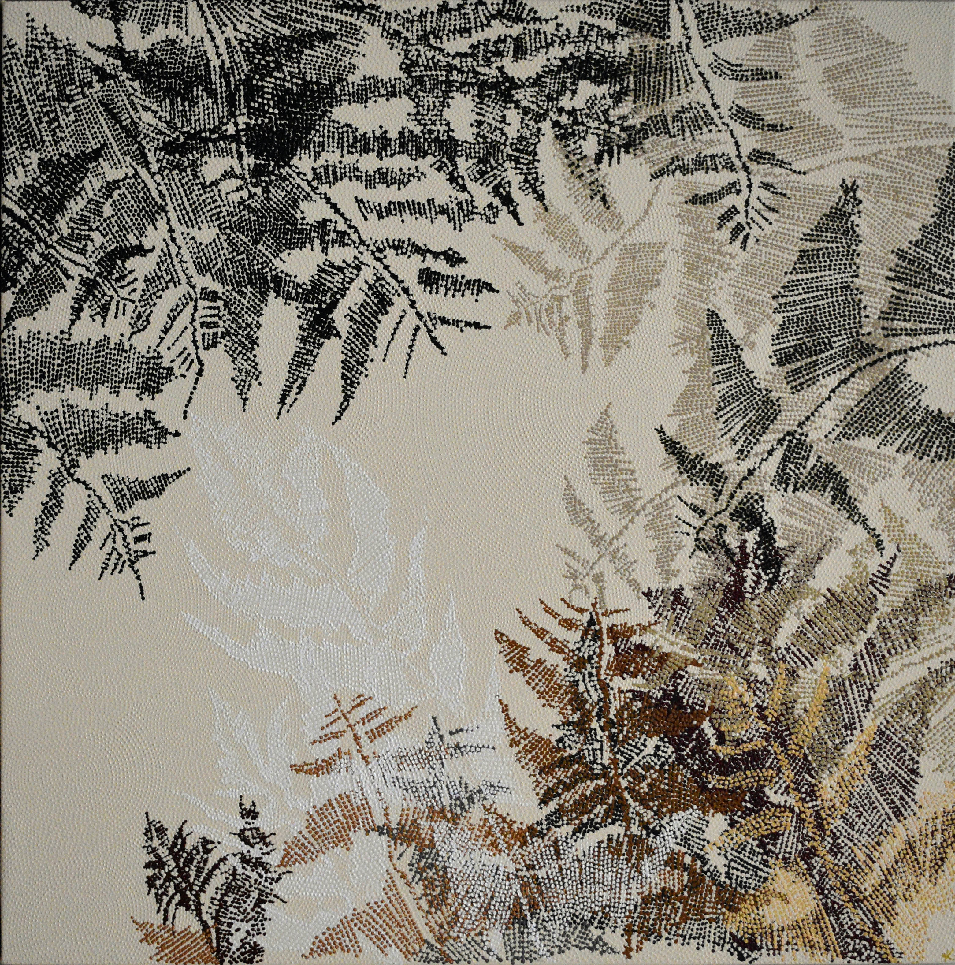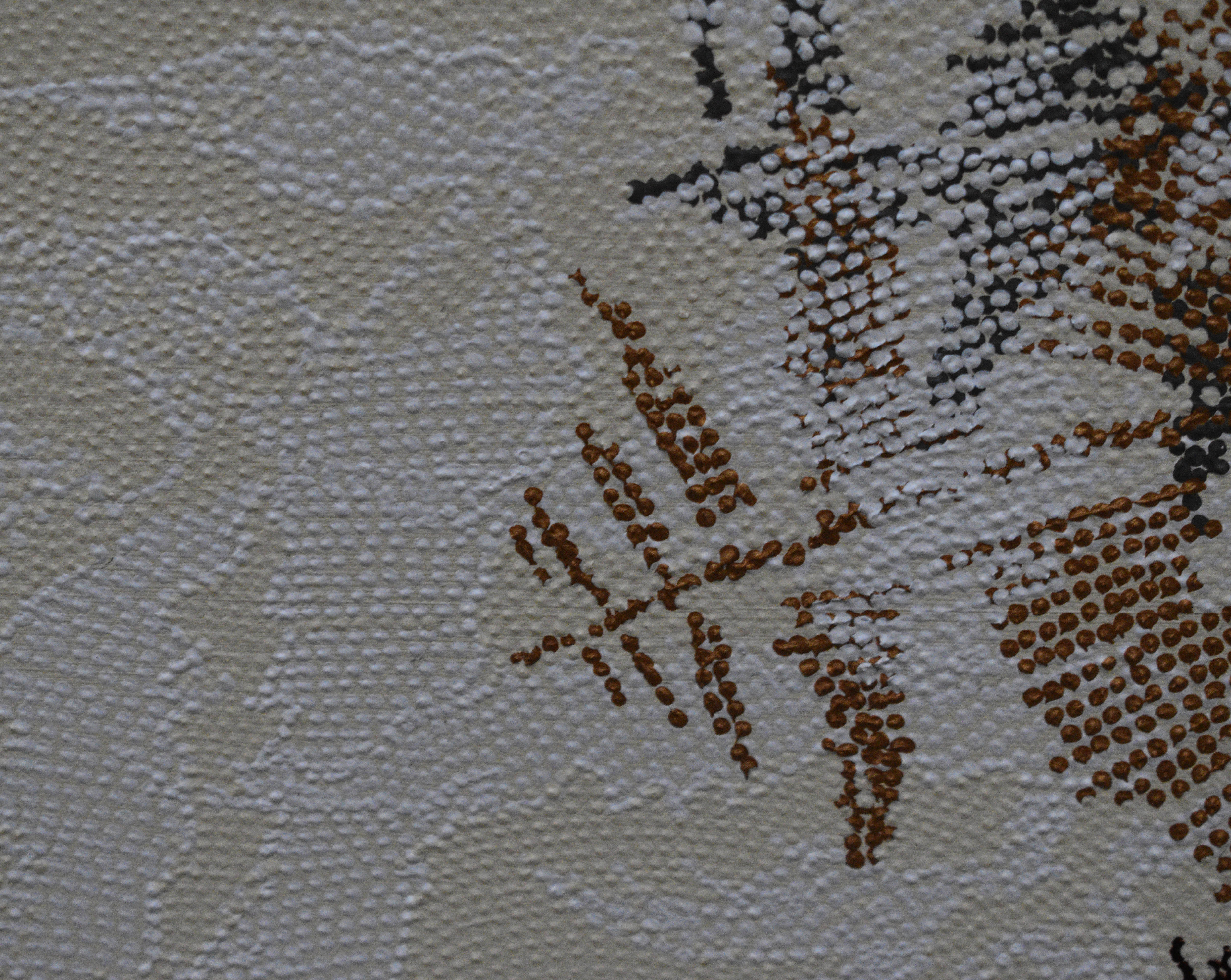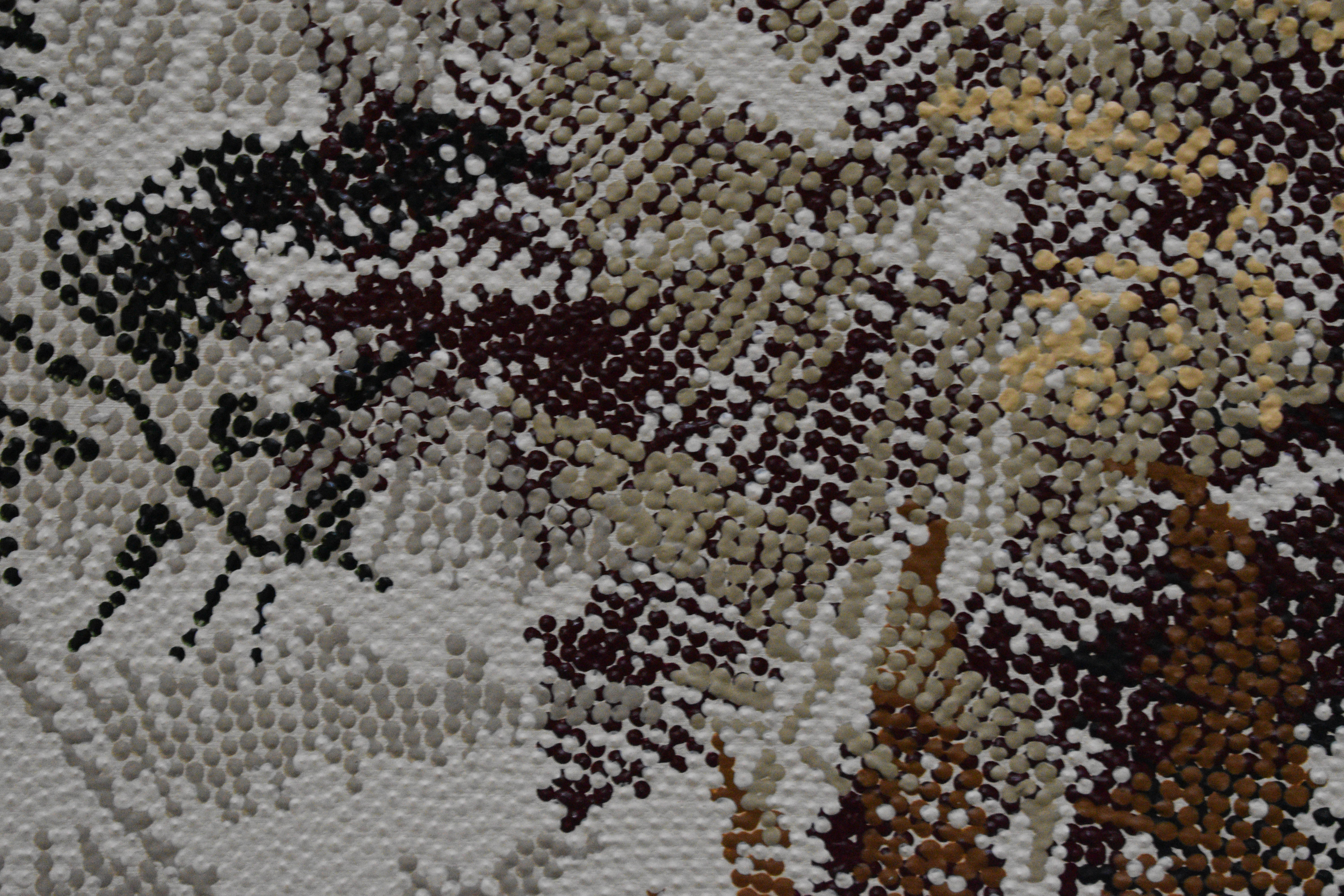 L’œuvre est remarquable, Konstantina y a utilisé des acryliques mates et brillantes, créant un effet de matière particulièrement riche et subtil. La matière, par ses jeux de lumière et ses reliefs, évoque des textures de perles ou de galuchat et suggère une végétation dense, composée de multiples strates du paysage. Ce langage visuel associe les motifs traditionnels de l’art aborigène à une dimension figurative incarnée par le feuillage.