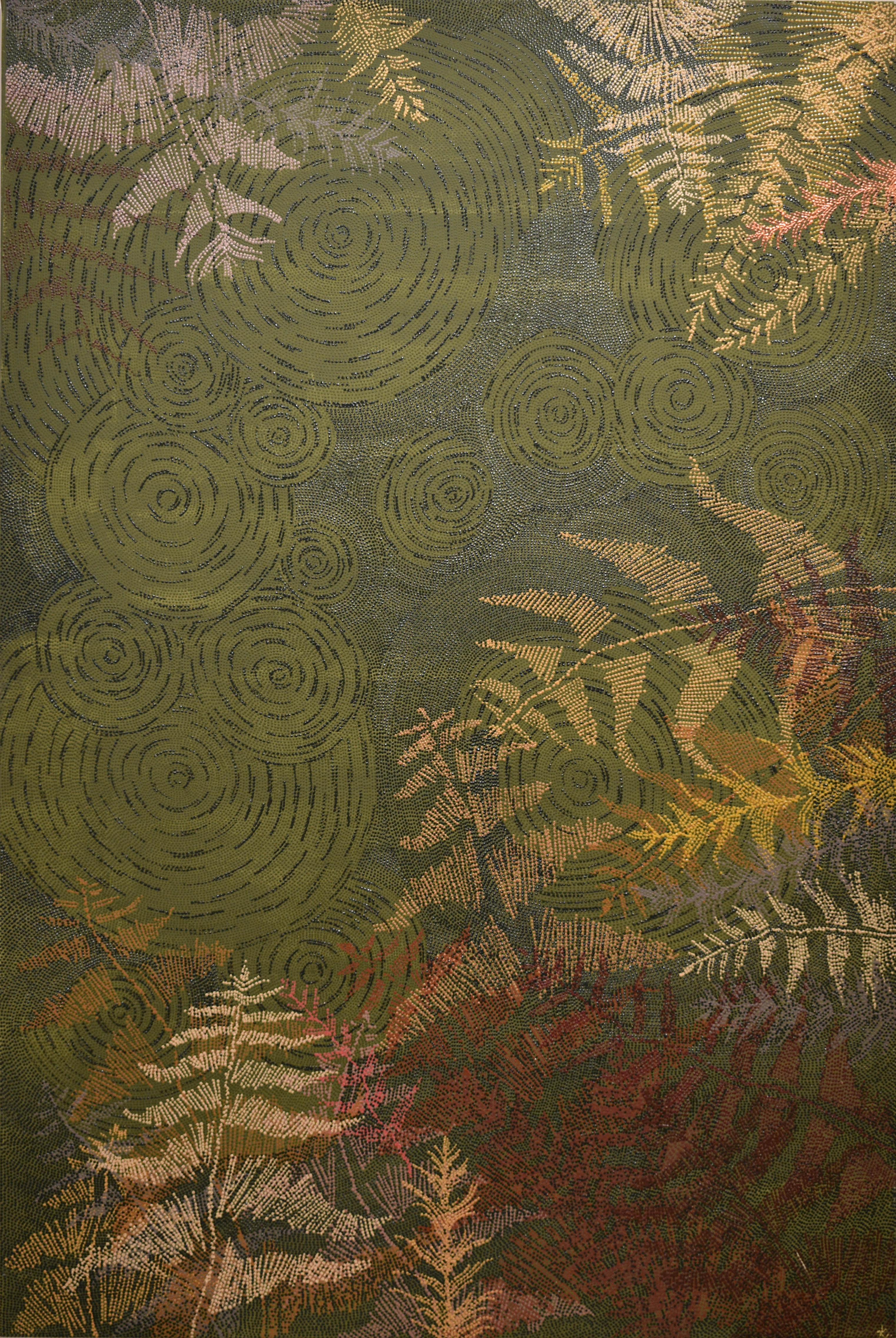L’œuvre est remarquable, Konstantina y a utilisé des acryliques mates et brillantes, créant un effet de matière particulièrement riche et subtil. La matière, par ses jeux de lumière et ses reliefs, évoque des textures de perles ou de galuchat et suggère une végétation dense, composée de multiples strates du paysage. Ce langage visuel associe les motifs traditionnels de l’art aborigène à une dimension figurative incarnée par le feuillage.