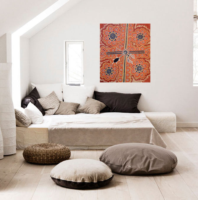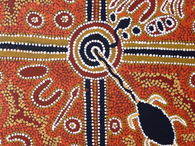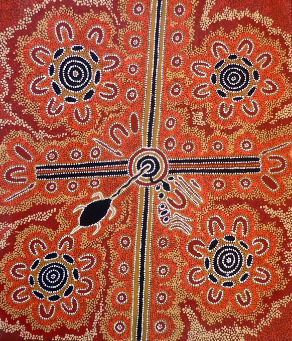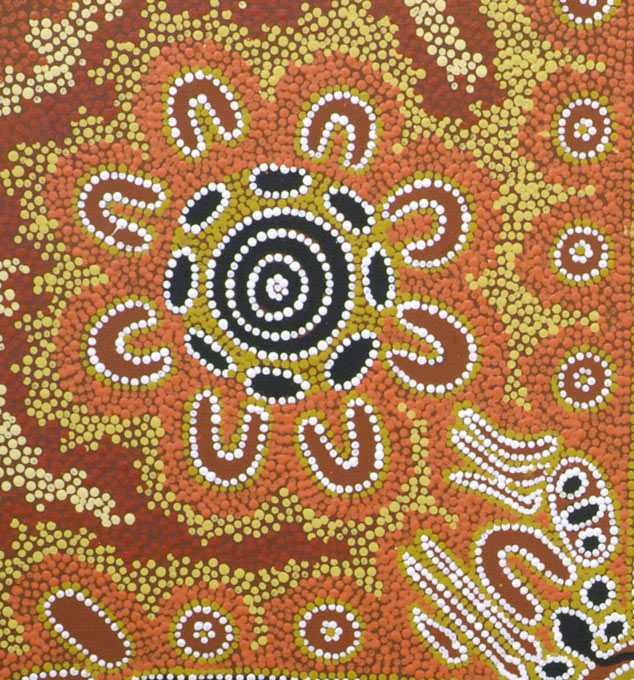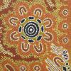 Cette oeuvre de l'artiste peintre aborigène Andrea Martin Nungarrayi est accompagnée du certificat d'authenticité de Warlukurlangu Artists Aboriginal Corporation 4044/09Dans cette toile l'artiste peintre aborigène Andrea Martin Nungarrayi retranscrit une cérémonie religieuse encore pratiquée aujourd'hui par les aborigènes qui a pour but de prévenir les membres de son clan des dangers d'une relation amoureuse illicite. La légende raconte qu'au Temps du Rêve (Dreamtime), un homme séduisit une femme qui lui était interdite du fait de lois claniques. En guise de punition, les deux amants furent transformés en deux rochers que l’on peut voir aujourd’hui sur le site de Ngarlu.Les formes en « U » que l’on retrouve à plusieurs endroits sur la toile représentent les participantes à la cérémonie. L’étrange motif central évoque un fuseau, sur lequel sont enroulées des cordelettes de cheveux humains, que l’on fait tourner tout en chantant les différents épisodes du mythe. L’ensemble de la scène est vue du ciel conformément à la tradition picturale aborigène.Stéphane Jacob dirige la galerie Arts d’Australie • Stéphane Jacob. Expert en Art Aborigène (C.N.E.S.), co-auteur du catalogue des peintures aborigènes des collections du musée des Confluences de Lyon et de l'ouvrage "La peinture aborigène" aux nouvelles Editions Scala. Il est signataire de la charte d’éthique australienne Indigenous Art Code, il s’attache depuis 1996 à faire connaître l’art et les artistes australiens aborigènes contemporains d’Australie.