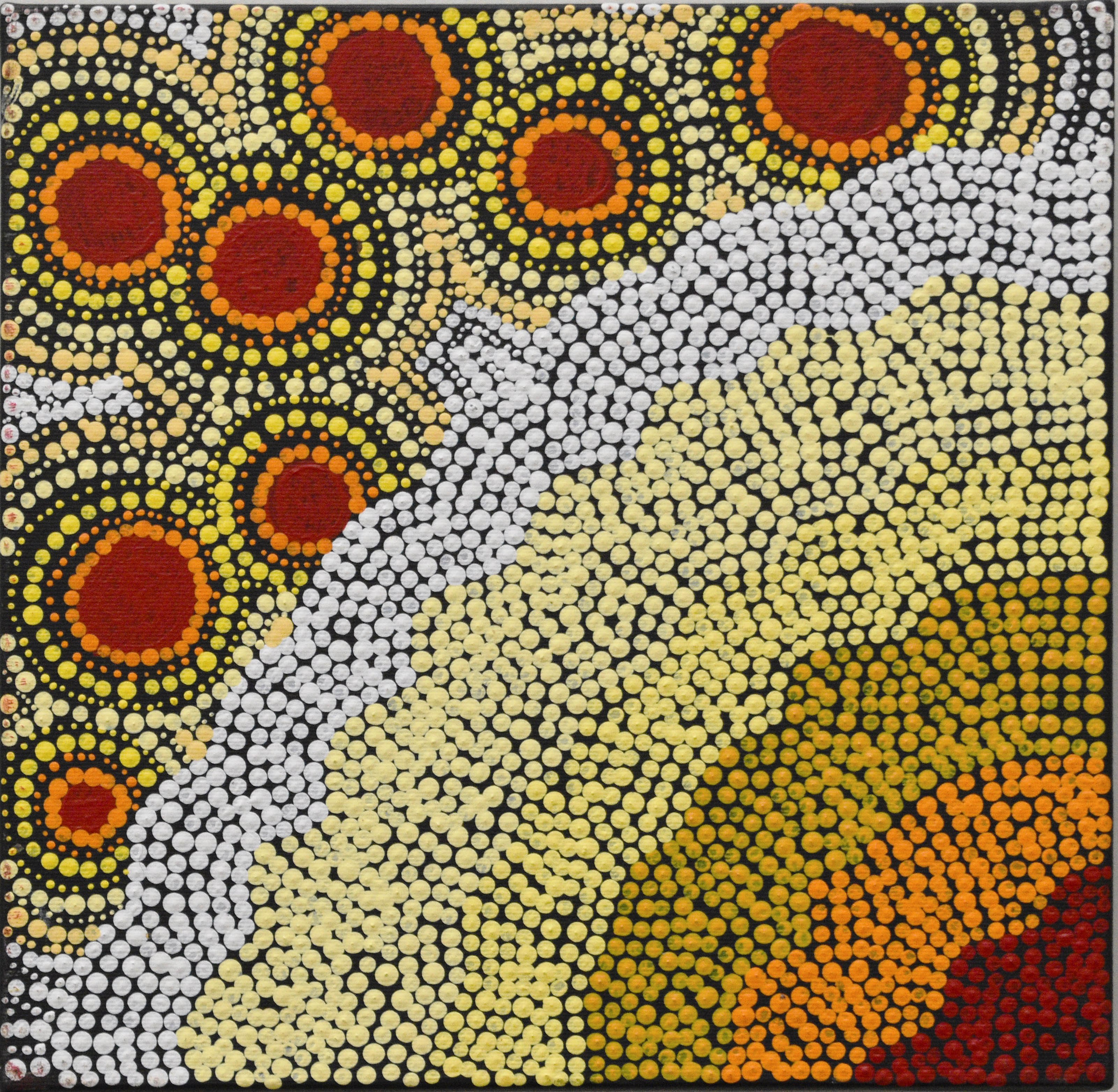 Dans cette oeuvre, Loretta White Nakamarra utilise la méthode du dot painting, ou pointillisme, qui s'inspire des peintures sur sol traditionnellement réalisées à l'occasion de cérémonies rituelles.