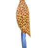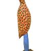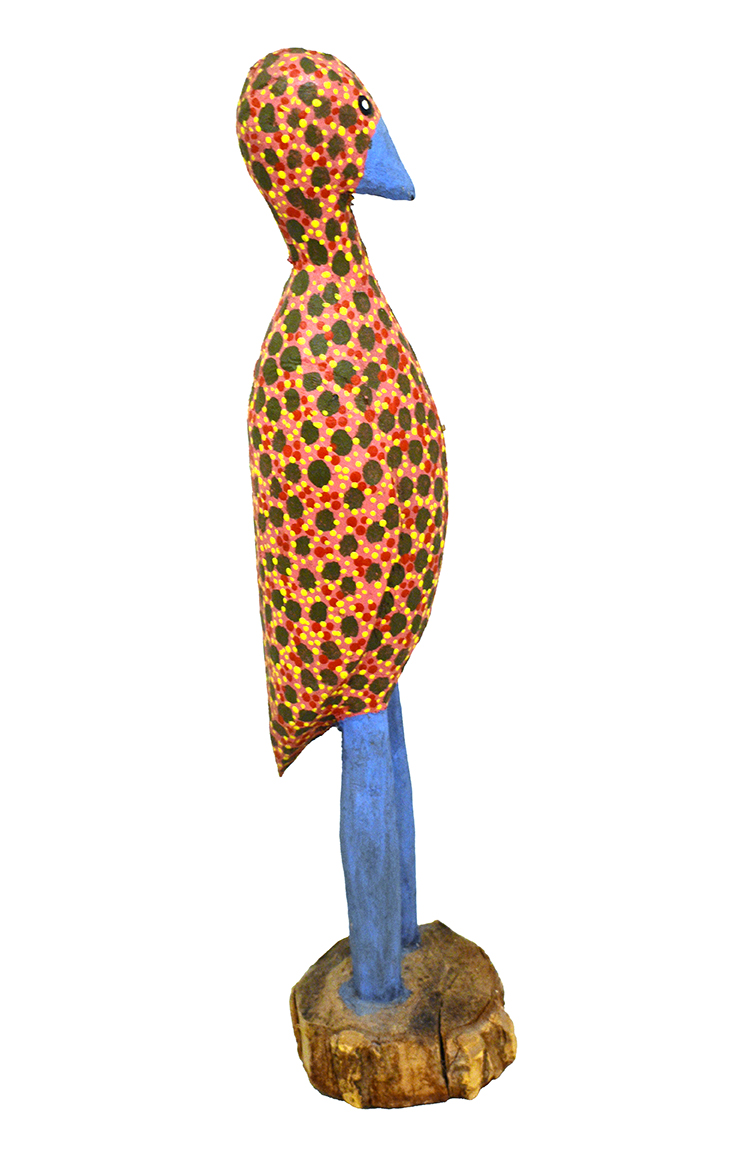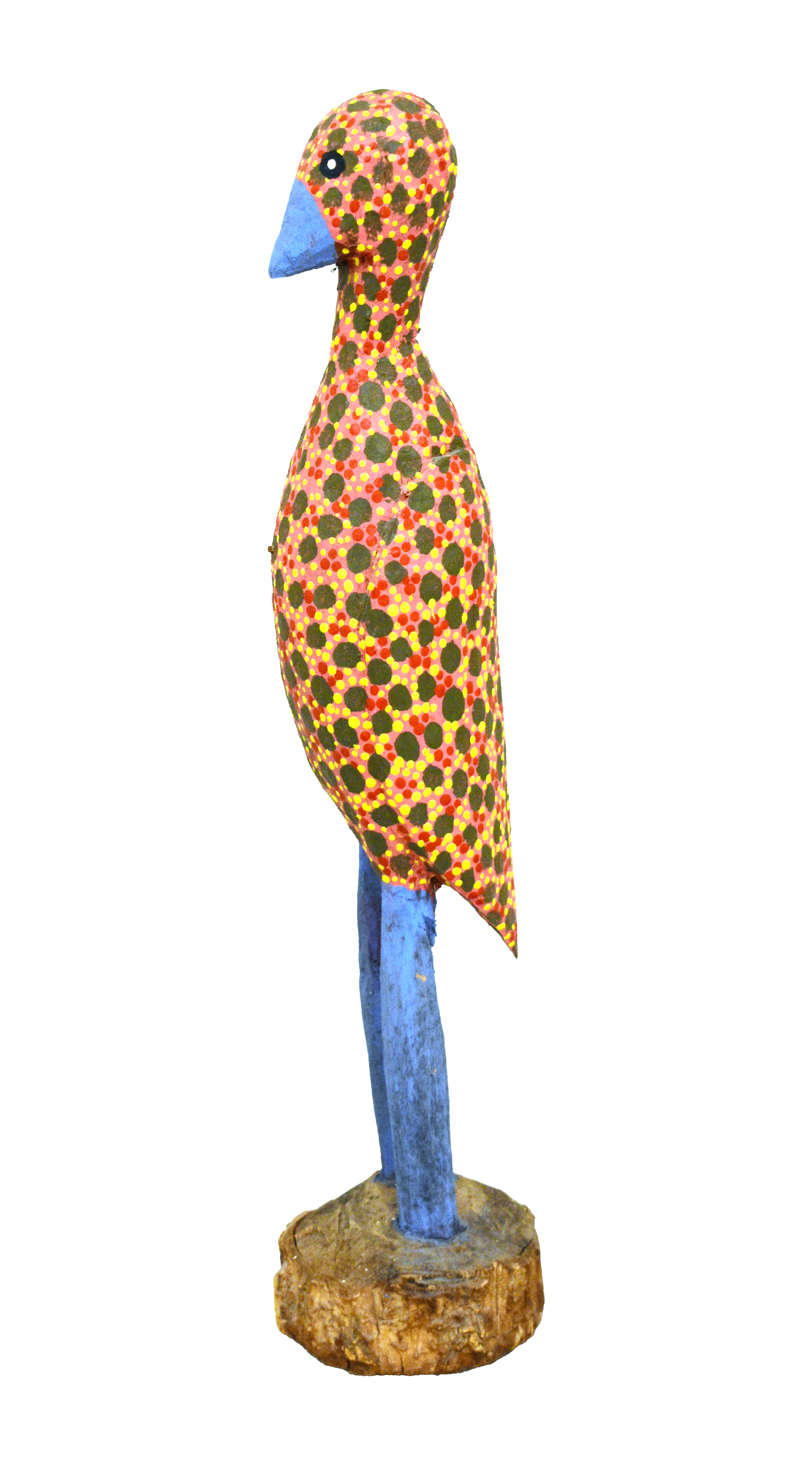 La surface est recouverte de points réalisés à l’acrylique, technique emblématique du mouvement artistique du désert central. Sur un fond rose vibrant, le corps est animé de points verts, chacun entouré de délicats points jaunes et rouges, créant un rythme visuel dense et dynamique. Le bec et les pattes, peints en bleu clair, apportent un contraste lumineux qui souligne la silhouette et équilibre la composition.