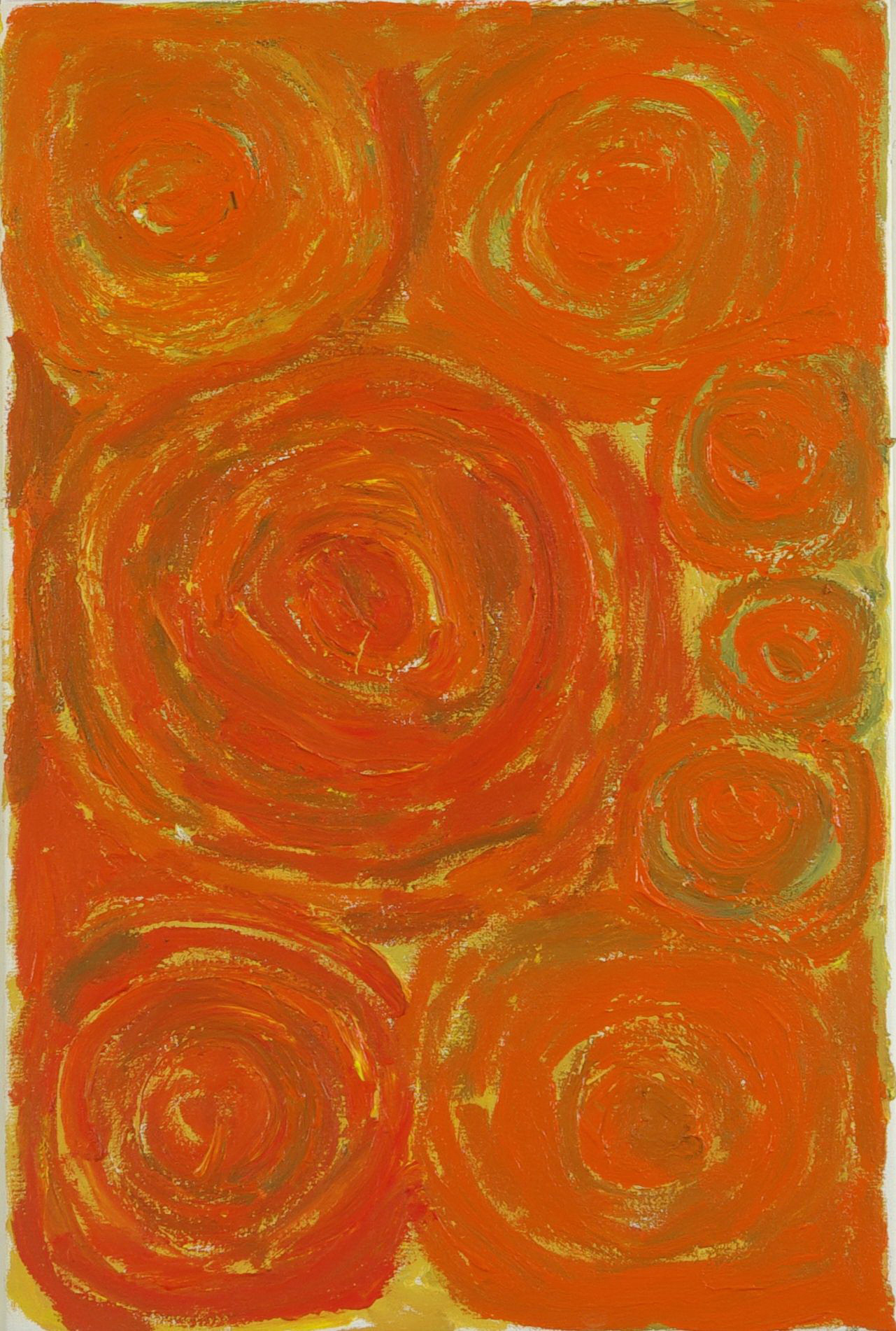On trouve sur le territoire de son peuple de nombreuses rivières dont la morphologie change entre la saison sèche et la saison des pluies. Ainsi les rochers que l’on trouve à l’intérieur de ces cours d’eau semblent resurgir à la surface à la saison sèche, créant autour d’eux comme des ondes vibratoires illustrées par cette oeuvre.