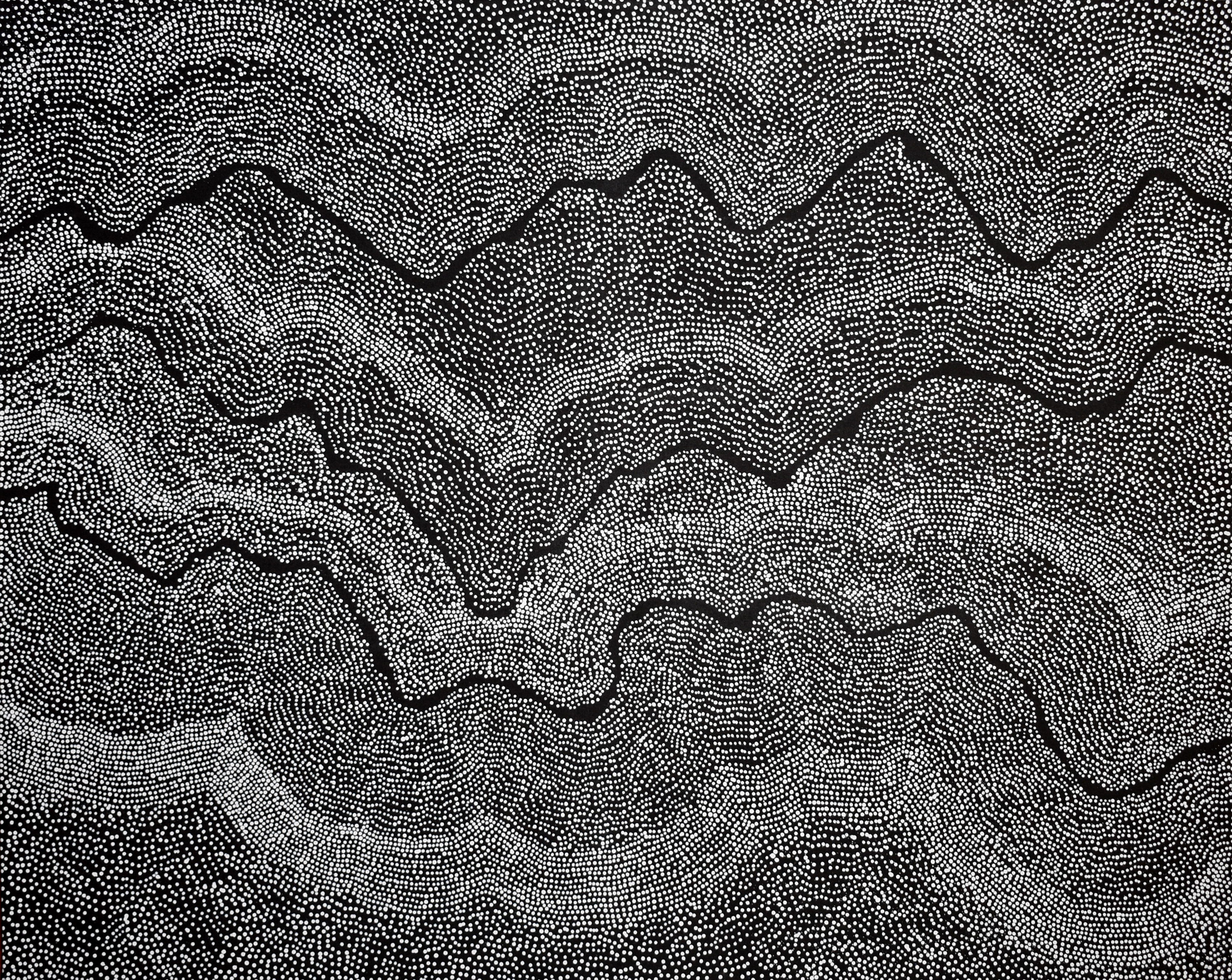 Dans cette oeuvre, l’artiste propose une « étude en noir » du site sacré de Pirlinyanu qui donne son nom à la toile. Mot à mot « lieu près d’un rocher », il s’agit d’un point d’eau creusé dans la roche dont l’existence est symbole de vie au sein du désert. Une telle représentation s’inscrit d’ailleurs en plein dans la tradition picturale du désert dont les représentants excellent à évoquer – plus qu’à représenter de manière figurative – des sites devenus lieux de cérémonies religieuses.