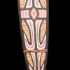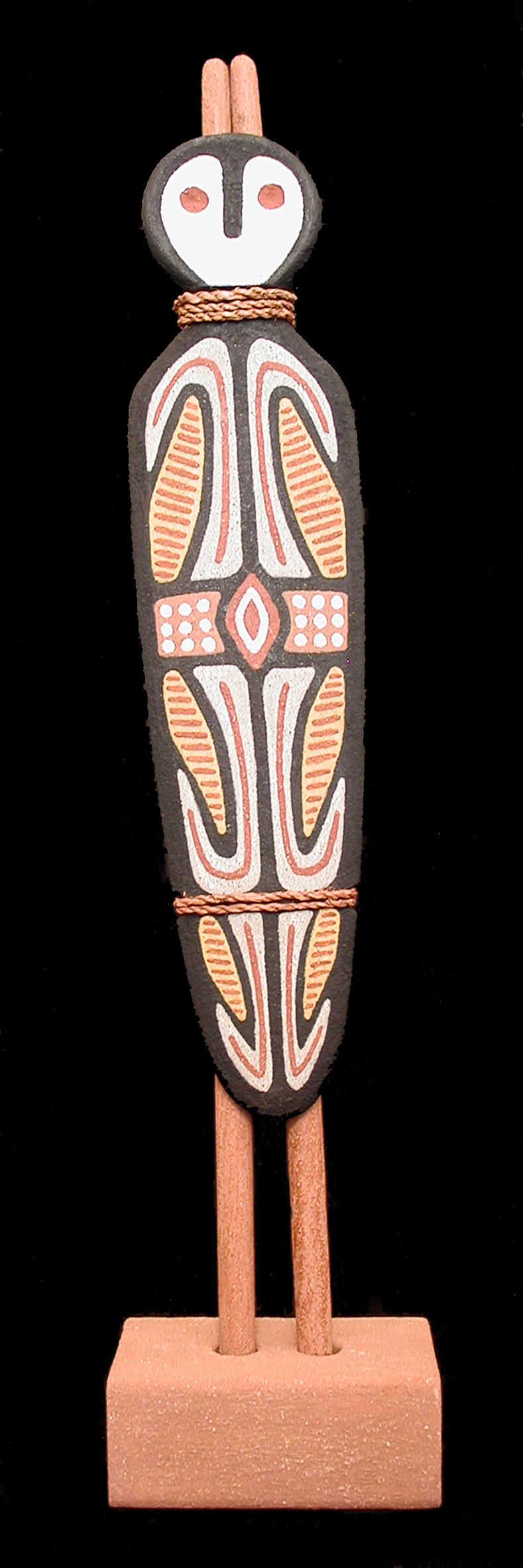 En prenant comme support une planchette à feu, le peintre semble réaliser avant tout un objet d’ordre ethnologique puisque la conception de ces planchettes remonte au Paléolithique. Mais les motifs (ici « de hameçon à crustacé ») qu’il invente ou réinterprète en les stylisant font de cet objet une véritable sculpture peinte relevant de l’art aborigène contemporain au même titre que les toiles du désert ou les œuvres de la Terre d’Arnhem.