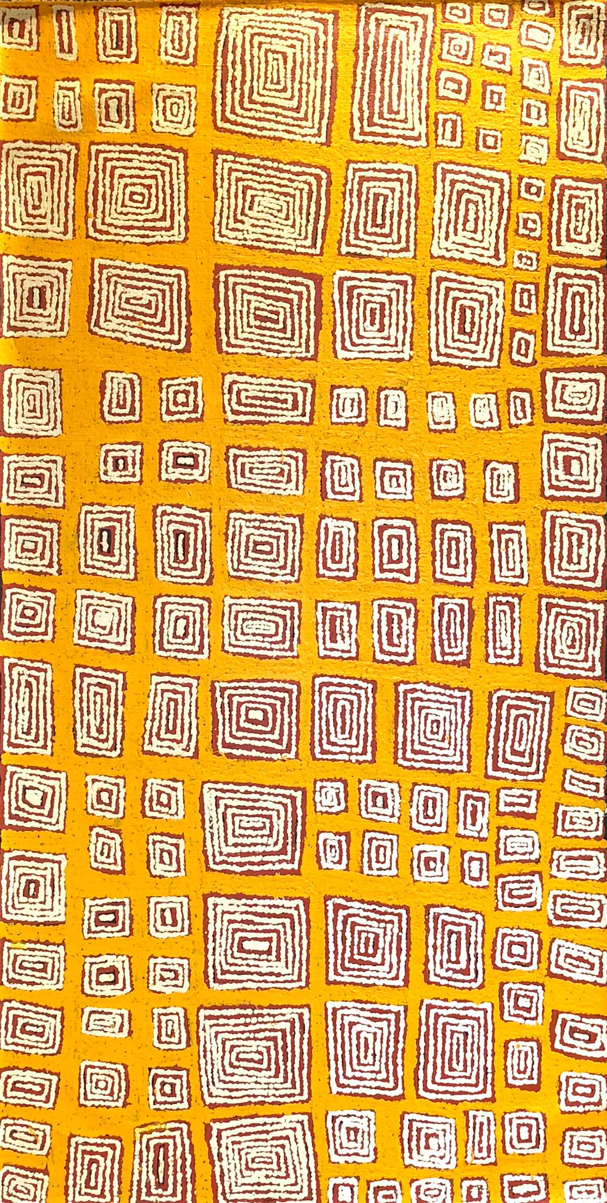 Conformément à la tradition de la peinture sur sol, Morris Gibson propose une vue satellitaire abstraite de Kaakuratintja : les multiples carrés tendent à représenter tous les sites qui parsèment le désert.