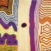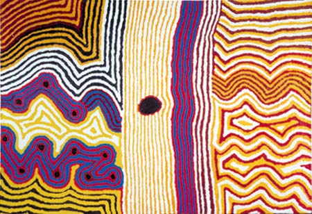 Originaire des Balgo Hills, Helicopter est un des maîtres de cet “art de l’absence” qui cherche à sauver par des toiles aux couleurs très vives le souvenir de régions dont les aborigènes ont été chassés par les colons blancs. Evocation d’un paysage de dunes, ce tableau en transforme les lignes en véritables vibrations lumineuses qui s’organisent autour d’un point d’eau sacré, au centre de la toile. La composition en triptyque de cette dernière en accentue la dimension sacrée.