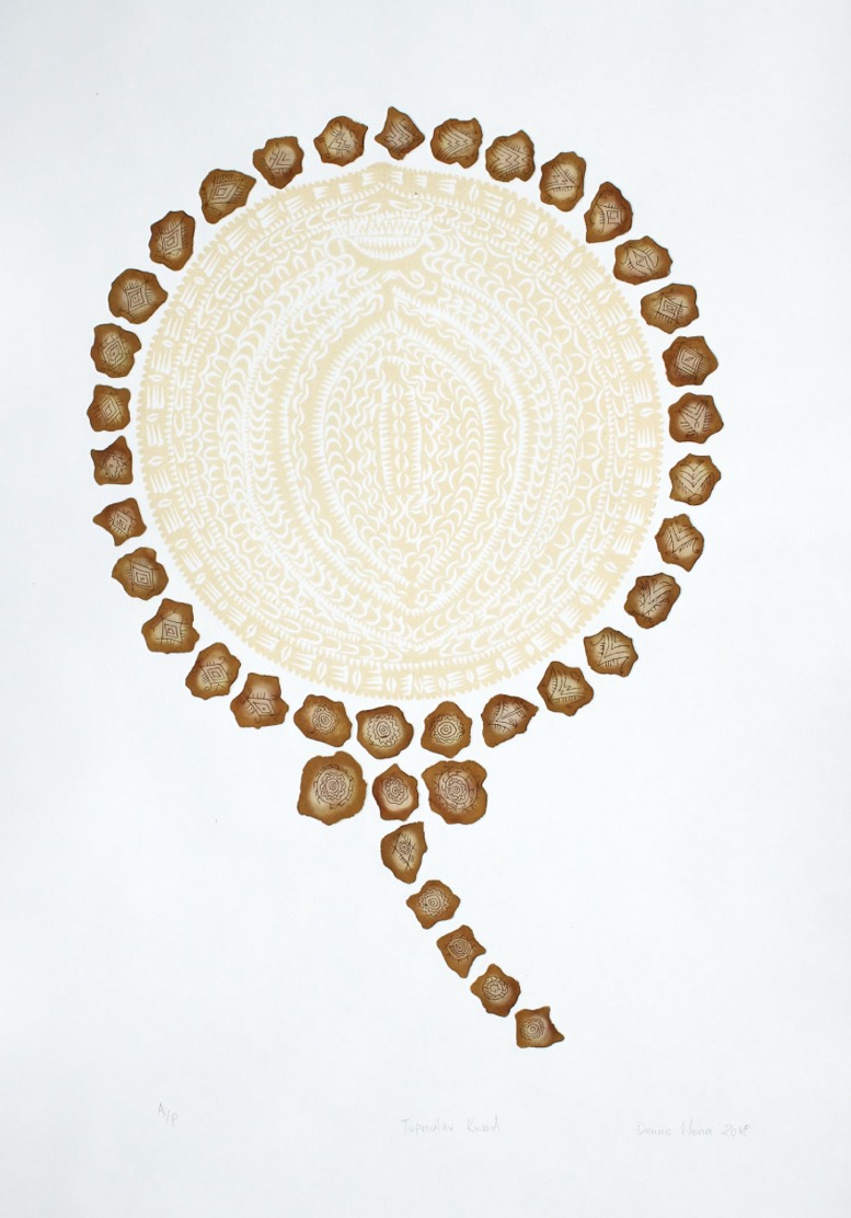 Tupmal au Kwod signifie lieu sacré pour les hommes au site du totem Raie pastenague, un lieu de rassemblement. Cette image représente la loi de l’île de Badu qui se transmet à travers son grand totem – connu sous le nom de Tupmal au saab. Cette loi et les discussions associées ne peuvent avoir lieu que dans le lieu sacré traditionnel de rassemblement de l’île de Badu, appelé Tupmal au Kwod.
