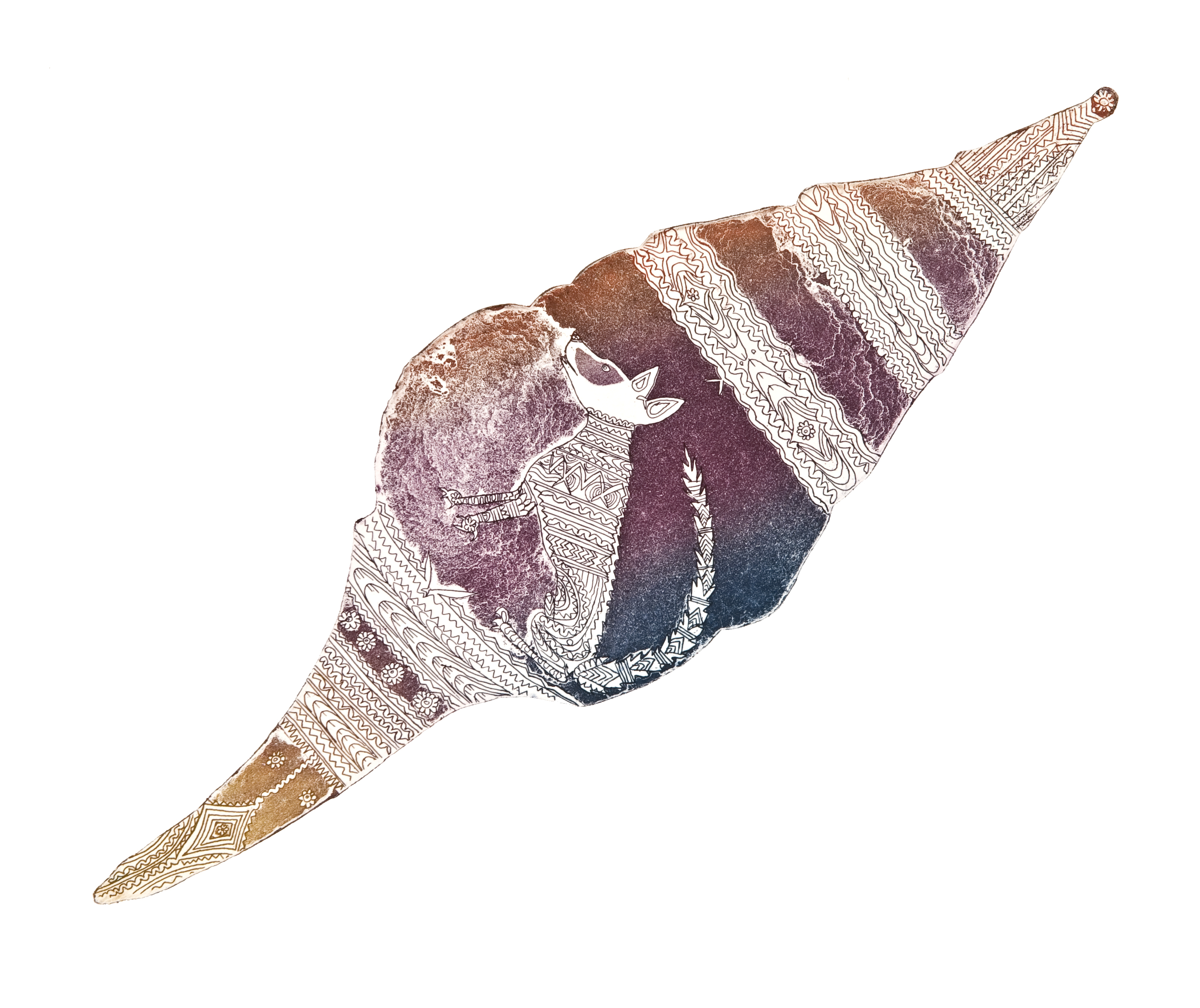 Le coquillage était séché et un trou percé à son extrémité. Le son émis dépendait de la taille du coquillage que l’on utilisait selon la nature du rassemblement.L’artiste a créé une série de six eaux-fortes qui représentent le Bu sur lequel différents totems de son île ont été incisés. Ces totems peuvent être vus peints dans les grottes rocheuses qui sont des lieux sacrés pour les habitants de l’île de Badu.