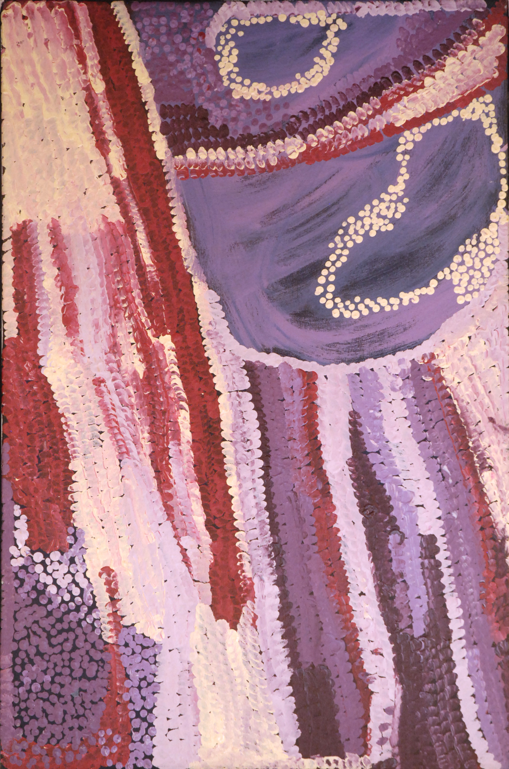 La jeune communauté de Martumili regroupe des artistes d’Australie Occidentale qui pour la plupart ne sont entrés en contact avec les Européens qu’à partir des années 1960. C’est la cas de Bugai Whyoulter qui vécut longtemps une vie nomade le long de la Canning Stock Route, une route mythique qui s’étend sur 2000 km. Elle y croisa ainsi des bergers “Blancs” mais aussi des Aborigènes employés par ceux-ci pour leur connaissance érudite de ce milieu aride et de ses rares réserves en eau naturelle.