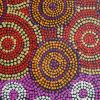 La peintre aborigène Debbie Brown vit dans la communauté de Yuendumu, à 250 kms au nord-ouest d’Alice Springs. Elle est une des “gardiennes” du lieu où pousse la tomate du bush et à ce titre, il lui incombe d’accomplir les rituels qui doivent maintenir la fertilité du site concerné : pour communiquer à la terre une force spirituelle qui soutiendra la croissance des végétaux, l’artiste et les femmes de son groupe clanique s’appliquent des peintures corporelles, chantent et dansent au cours de cérémonies sacrées dites “awelye” au cours desquelles on peint aussi le sol en recourant à la technique des pointillés caractéristique de l’art pictural du désert central que Debbie Brown reprend ici.