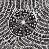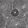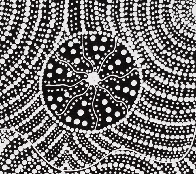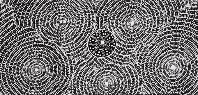 Natasha Oldfield NAKAMARRA évoque ici le Rêve (Jukurrpa) du Serpent (Warna) lié au site sacré de Ngama, situé au sud de sa communauté. L’histoire contée par cette toile a pour héro principal Yarrilpi, l’ancêtre serpent, qui voyagea à travers toute l’Australie afin de retrouver sa famille alors qu’il était handicapé. Il fut transporté tout au long de son périple par le “kurdungurlu”, celui qui a la charge de faire respecter les lois enseignées dans les rêves. A chaque fois que sa queue s’enroulait et touchait le sol, des marais apparaissaient. Ce rêve très important explique comment les multiples marais dont dépendent la survie des peuples du désert ont été créés et surtout donne des repères spatiaux pour les trouver en fonction des dunes, des promontoires rocheux, etc. Les lignes de pointillés en zig zag qui séparent la toile en deux représentent, vues du ciel, les traces laissées par le serpent. Les cercles concentriques dans le fonds de la toile symbolisent quant à eux des sites sacrés évoqués dans le rêve qui sont la plupart du temps des points d’eau. Les cercles plus sombres représentent probablement les réceptacles de fleurs couverts de leurs graines.
