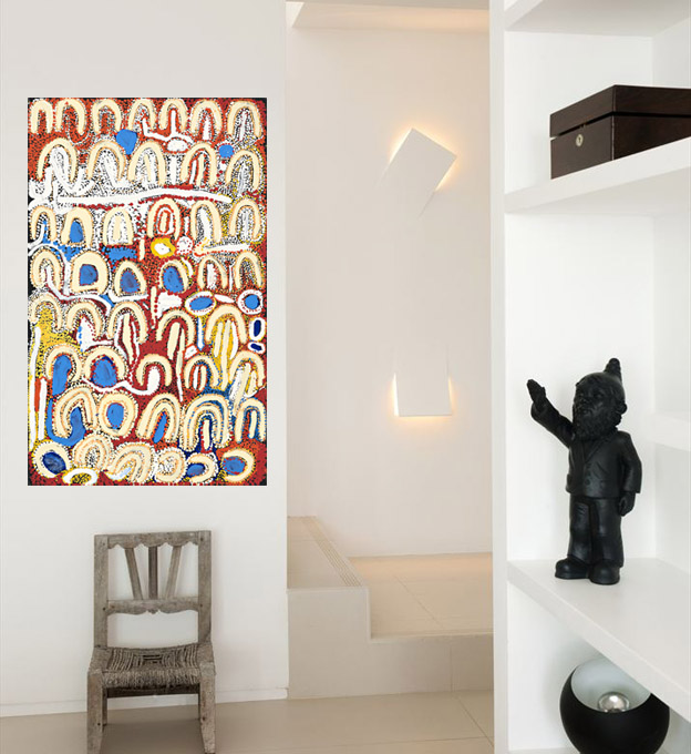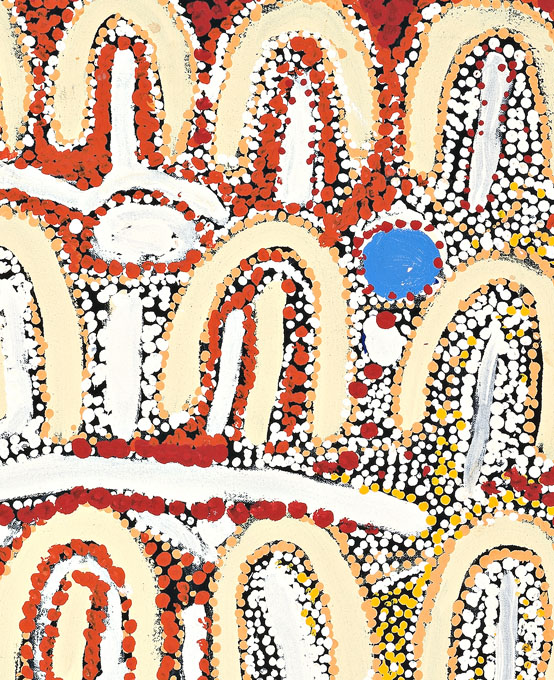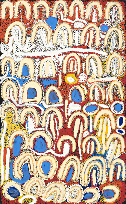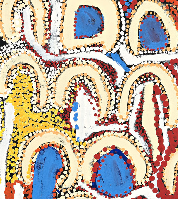 Jakayu fait partie de cette génération d’artistes aborigènes nés dans le désert qui n’ont rencontré les blancs qu’à l’âge adulte.Elle représente avec cette toile Wikirri, un des territoires qu’elle traversait régulièrement avec sa famille dans le désert à la recherche de nourriture. Bien que l’artiste utilise les codes graphiques utilisés par son peuple depuis des millénaires pour peindre sa terre, on reste subjugué par la modernité de cette peinture aborigène.