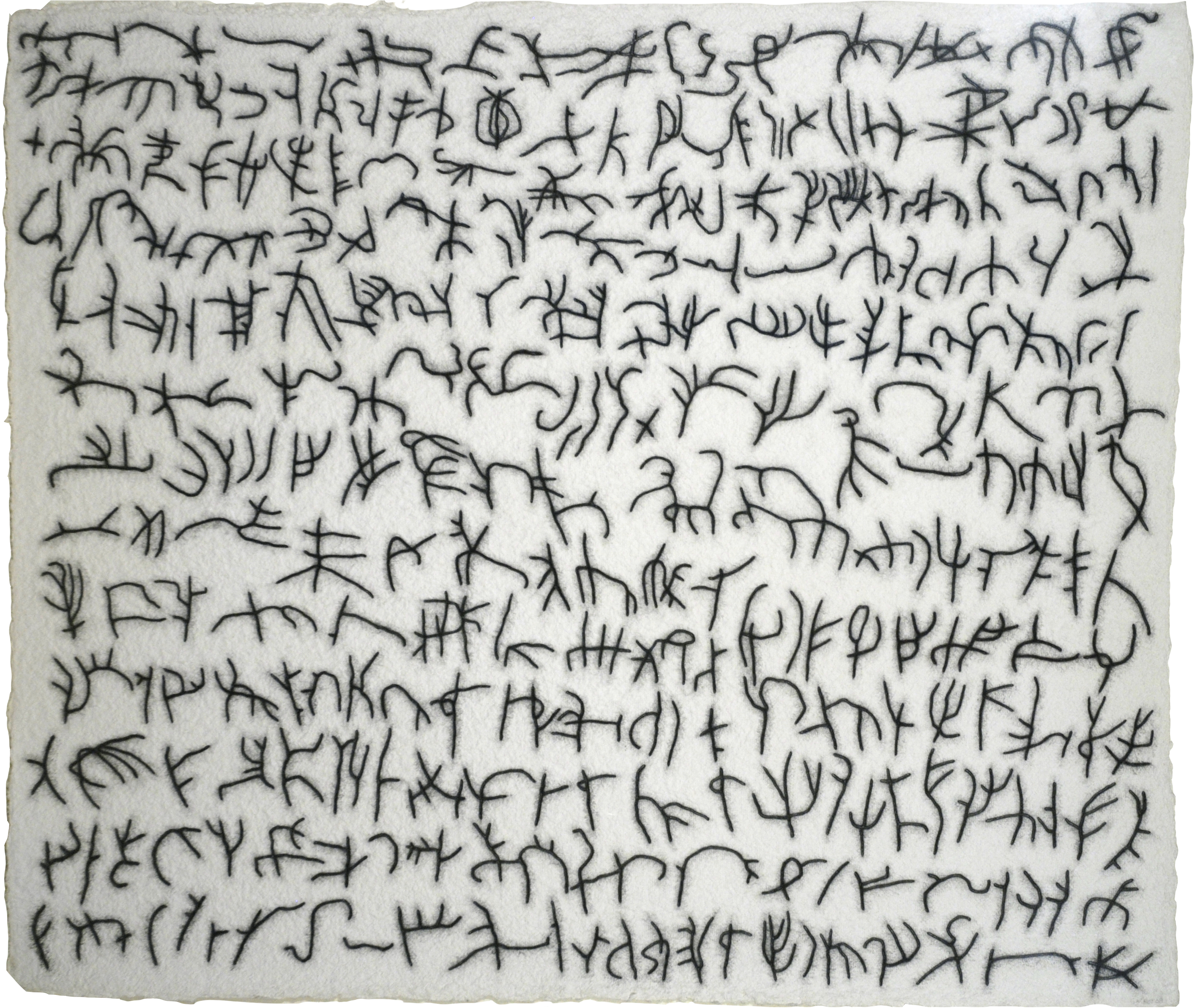 Her glyphs operate on multiple levels with allusions and associations to abstract forms in the landscape. Parallels can also be drawn with cosmological markings, mapping the progression of time, seasons, or natural events.