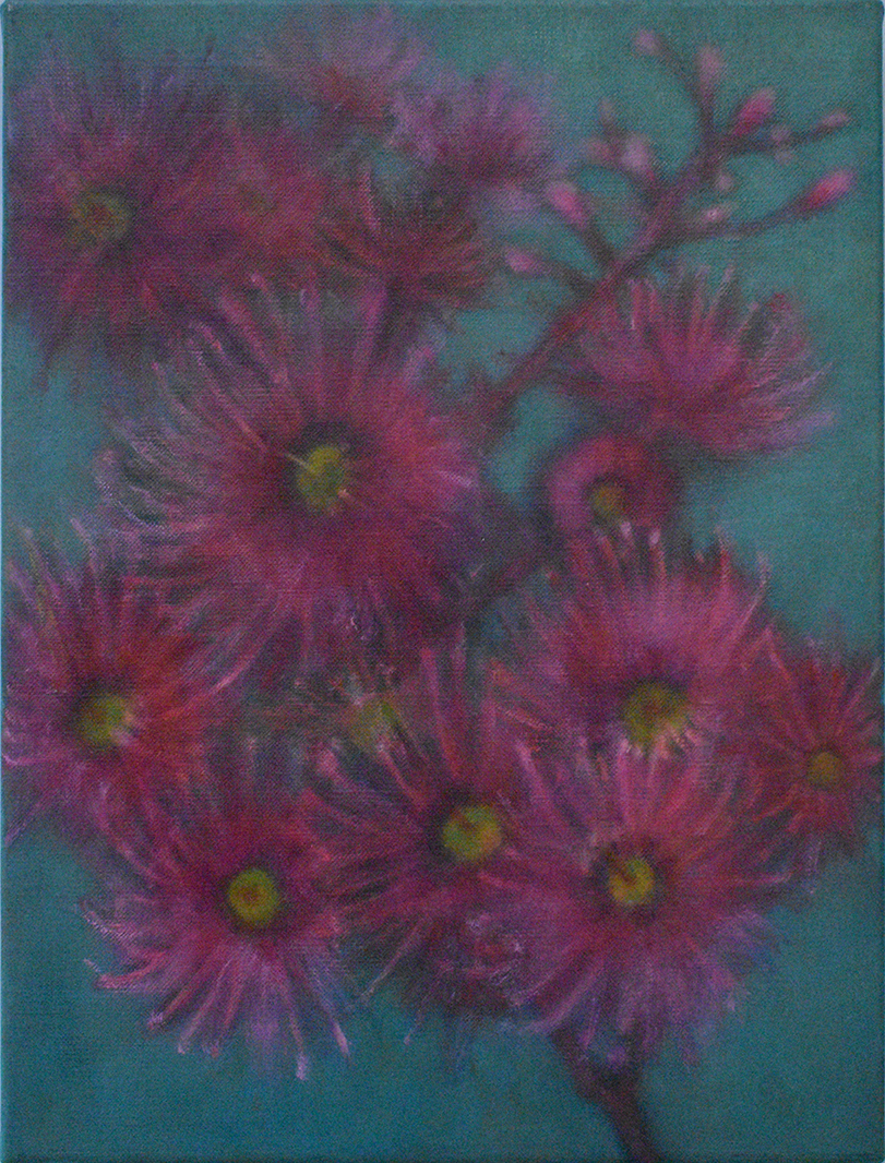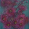 In this painting, the artist depicts a branch of eucalyptus flowers, or gum blossoms, a plant native to Australia. These distinctive blooms, with their soft pink stamens, are symbols of resilience and renewal in Australian culture - flourishing in even the harshest landscapes and often regenerating after fire.